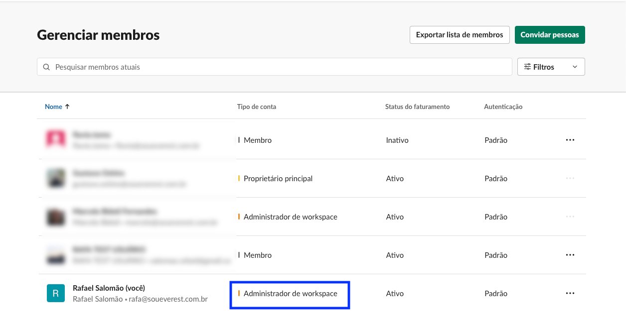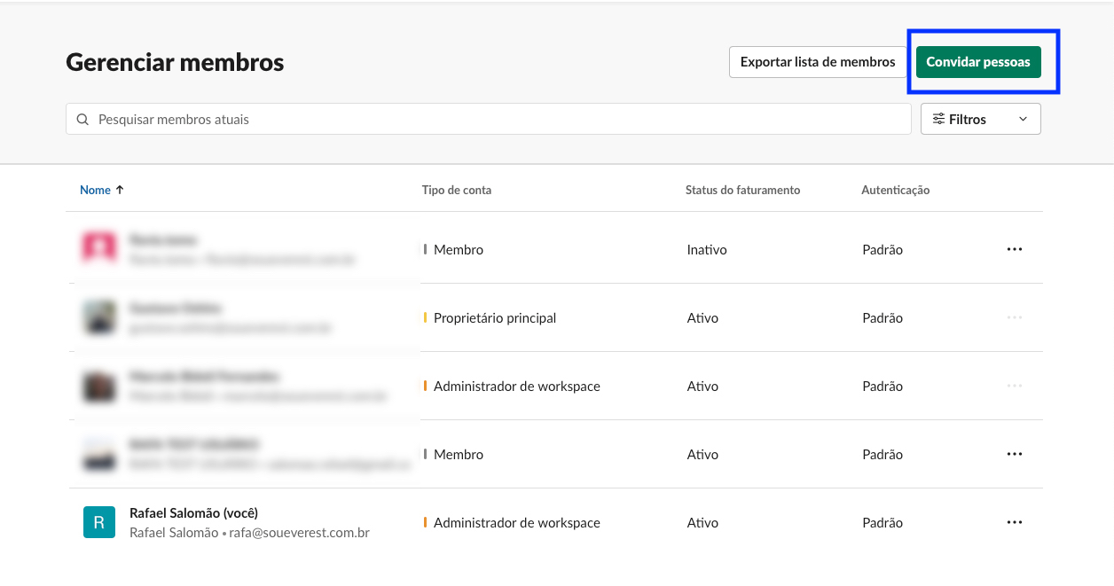 IMPORTANTE: caso tenha alguma licença disponível, recomendamos que seja criado um usuário só para nossa conta, para não ter risco desse usuário ser deletado. Caso ele seja deletado, não vamos mais conseguir atualizar o nosso sistema. Ou se não tiver nenhuma licença disponível, recomendamos que conecte ao Slack com um usuário que nunca será deletado.