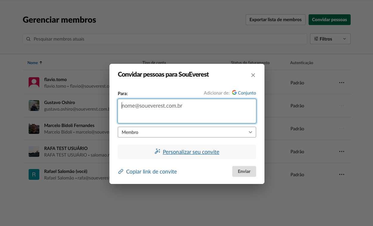 Digite o email da pessoa e a adicione como Membro.