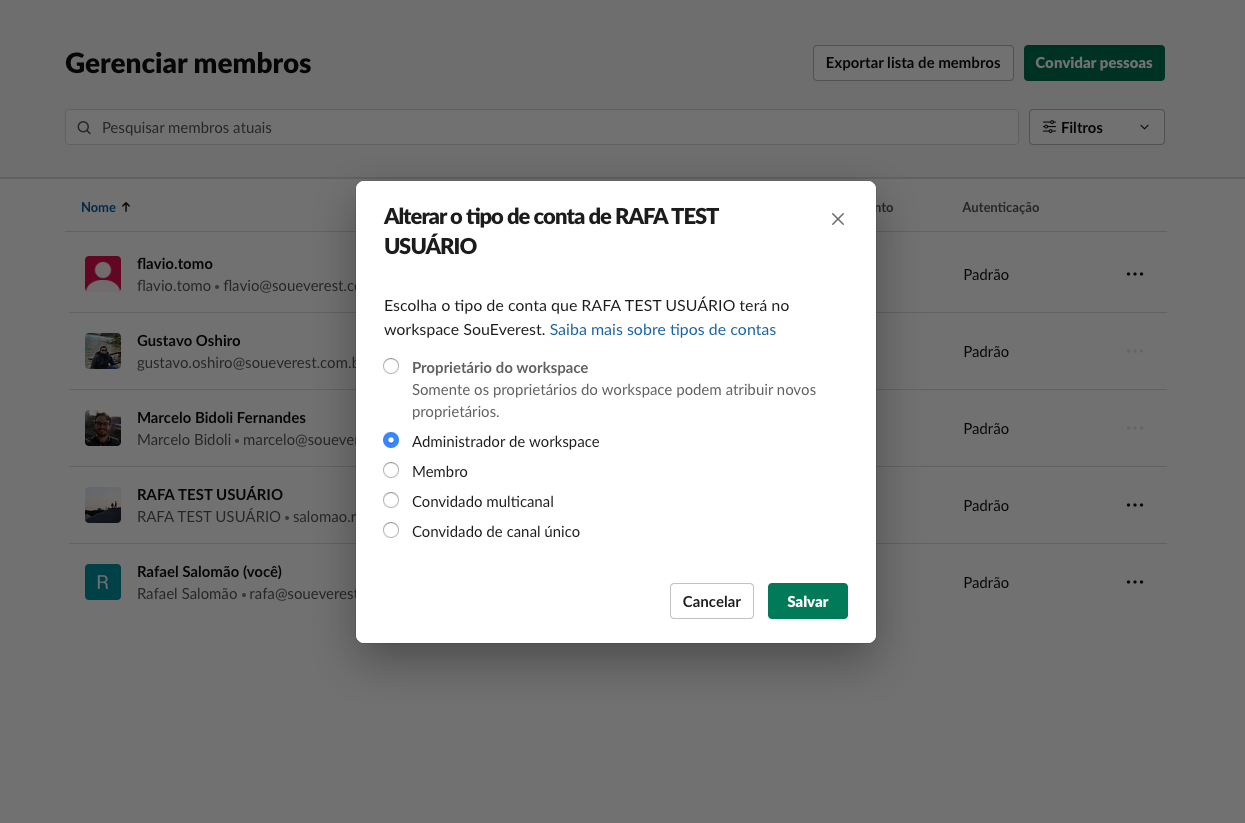 Selecione "Administrador de workspace" e clique em SALVAR.