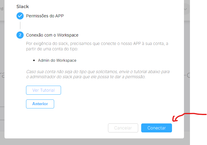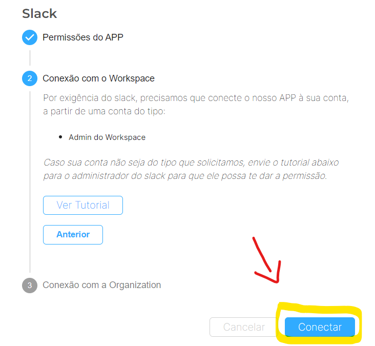 Para conectar com escopo de leitura, é necessário conectar somente ao Workspace do Slack. Avance para o passo 2 da conexão e clique em "Conectar".