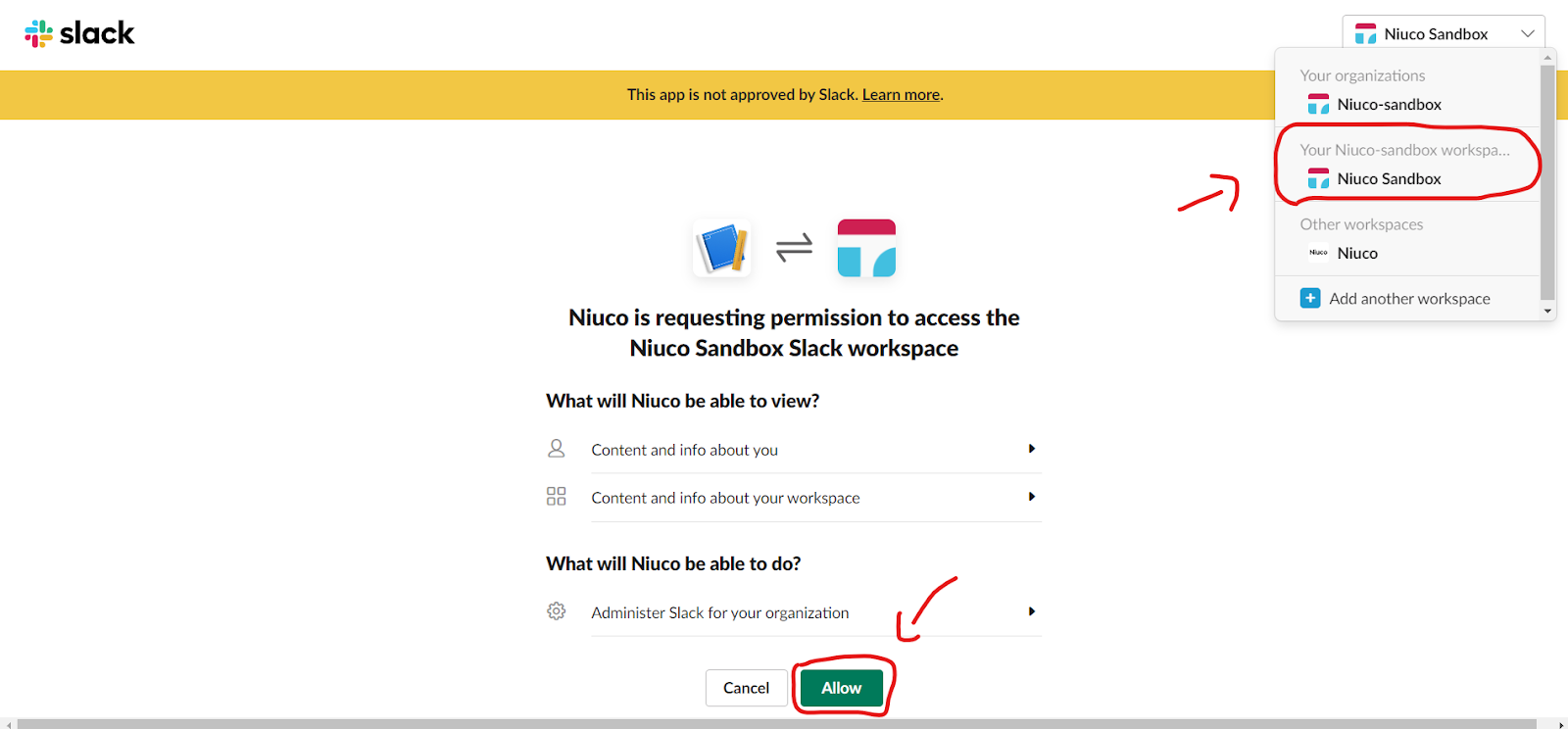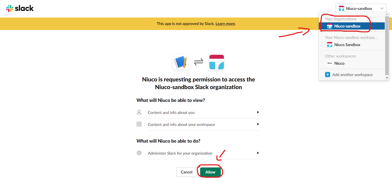 Após clicar em conectar, você será direcionado a uma outra tela. Nesta outra dela você deverá selecionar no canto superior direito a opção “Your [nome] workspace” e então clicar em “Allow”: