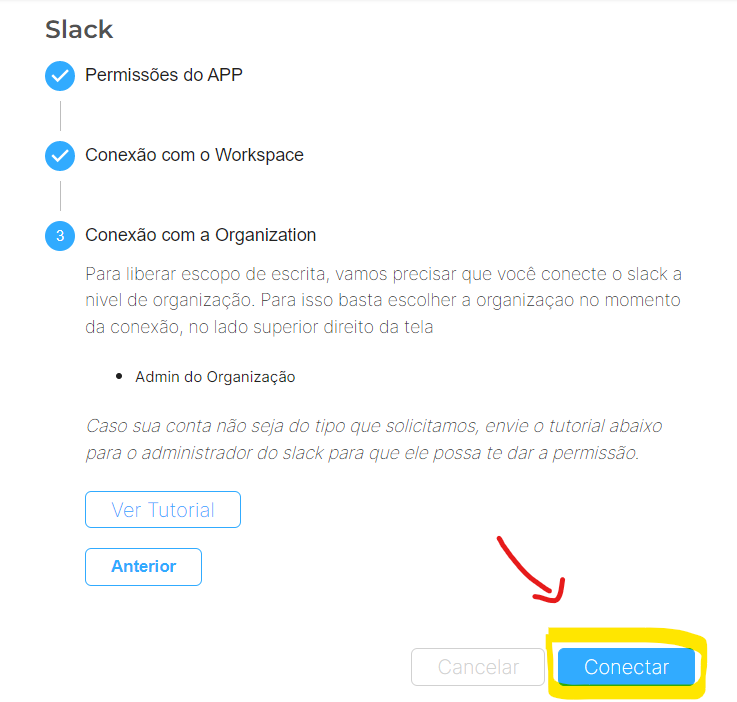 Para conectar com escopo de leitura/escrita, é necessário conectar primeiro ao Workspace e depois da Organization do Slack.