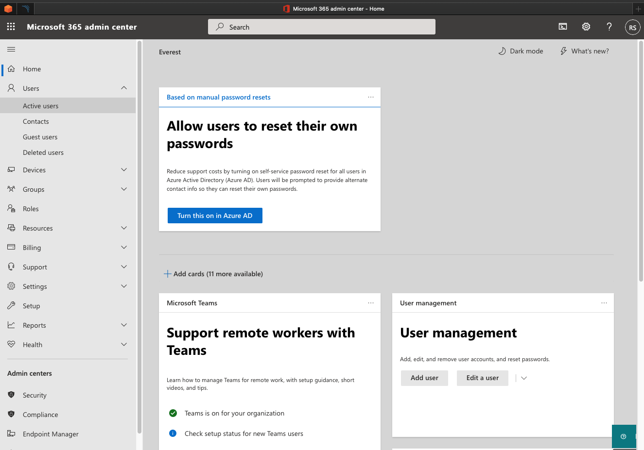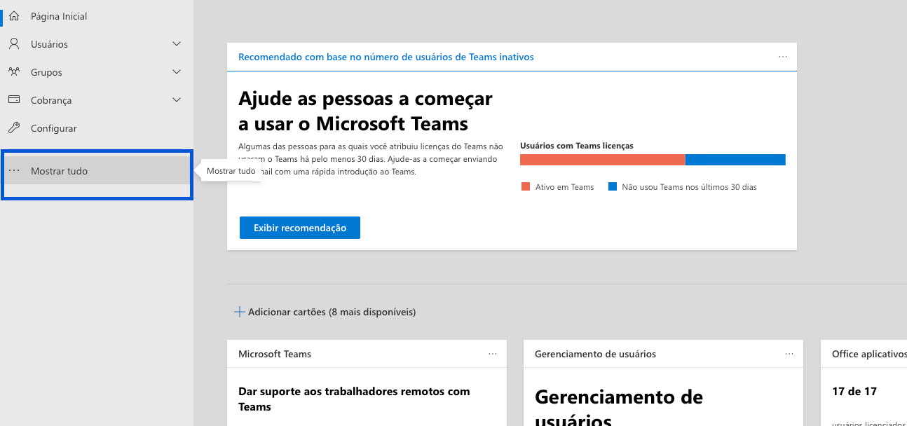 O link para entrar nele é esse: https://admin.microsoft.com/ e no menu na lateral esquerda, clique em Mostrar Tudo