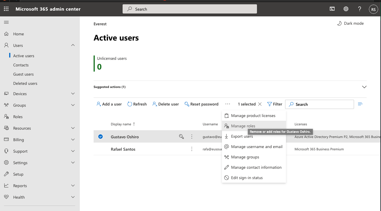 A2. Selecione o seu usuário e nos três pontos, clique em Manage Roles.