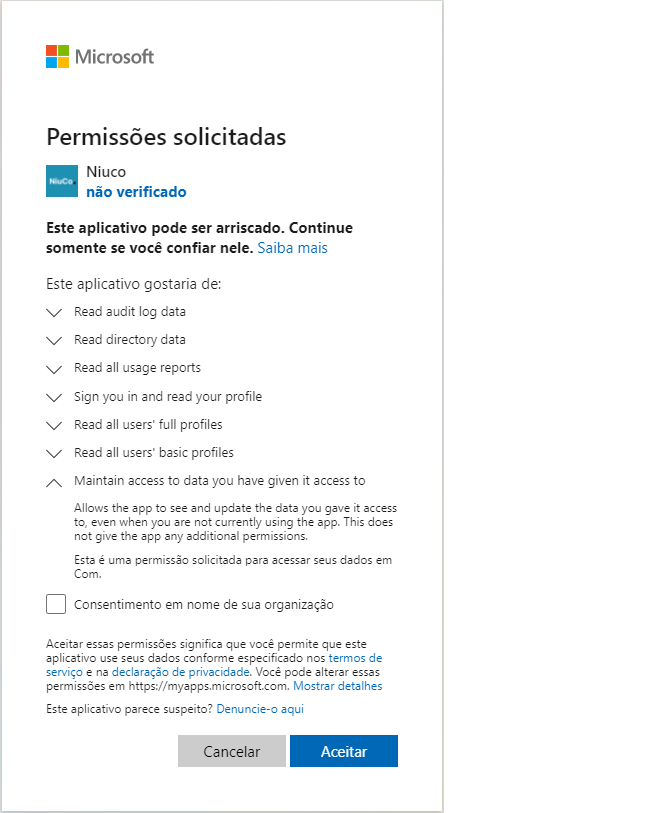C2. Na tela do Office, você verá os escopos solicitados*