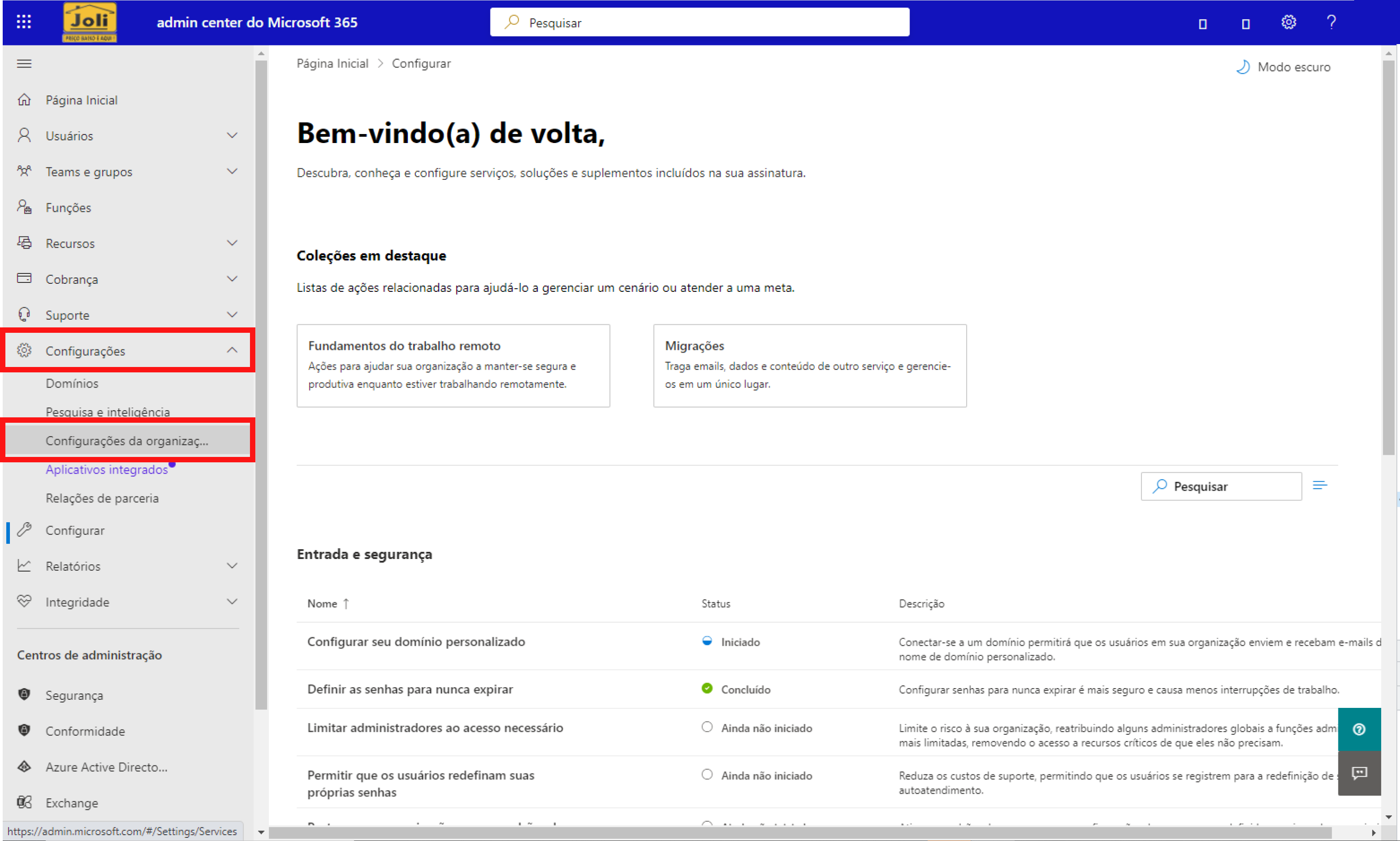 Após ter clicado em Mostrar Tudo, clique em Configurações, depois em Configurações da organização
