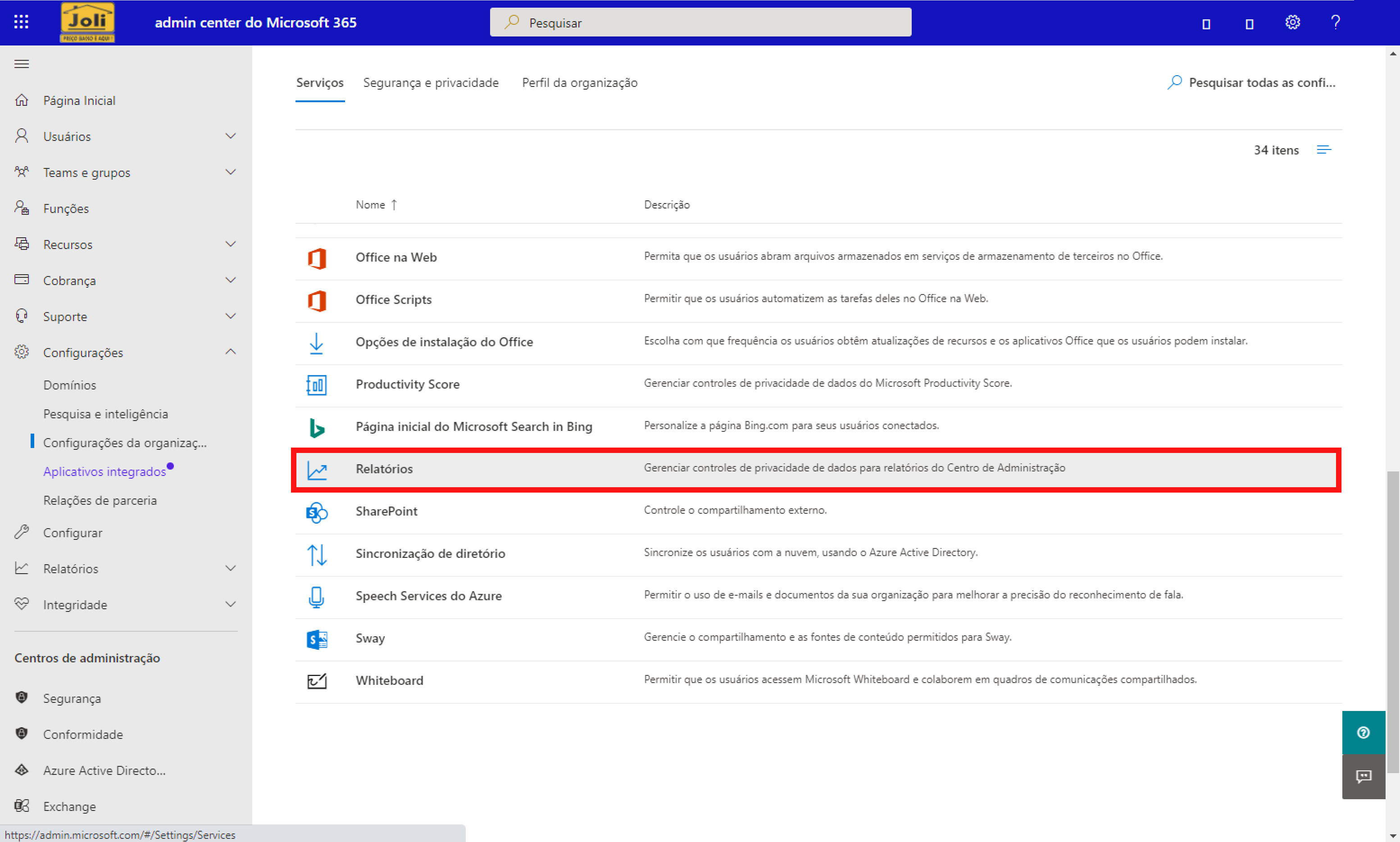 Nessa tela, haverá uma lista se serviços. Nessa lista, procure o serviço Relatórios e clique nele.