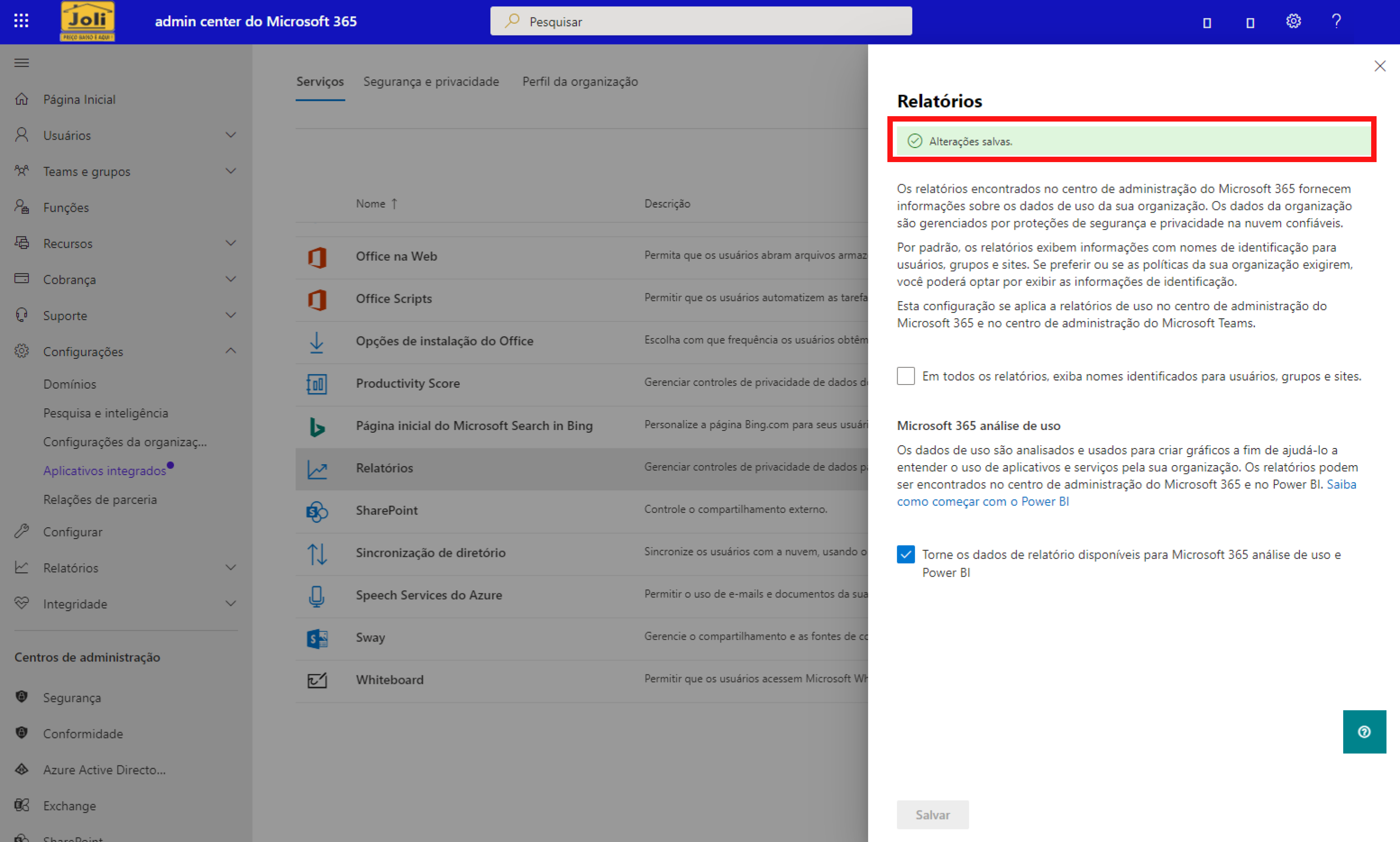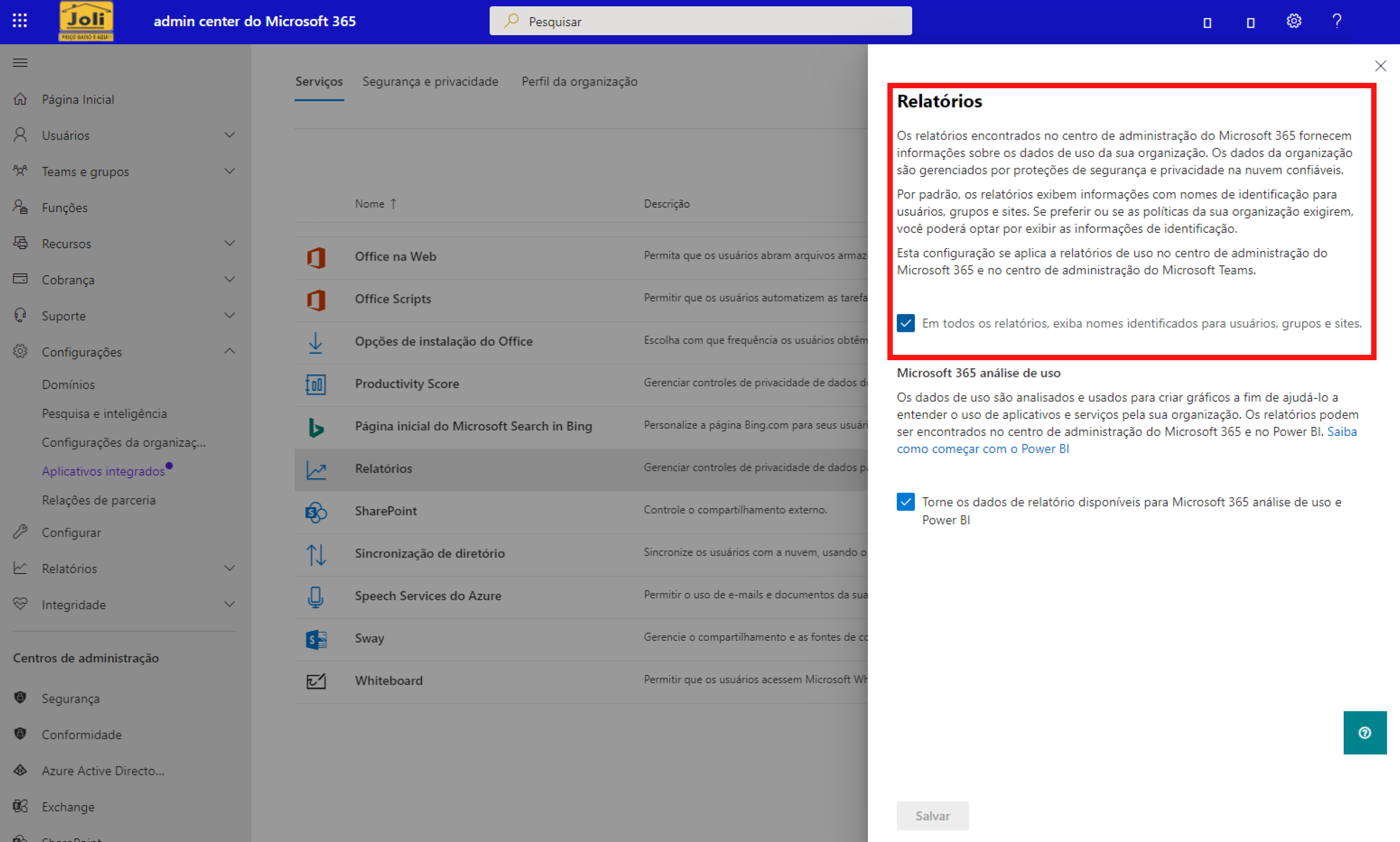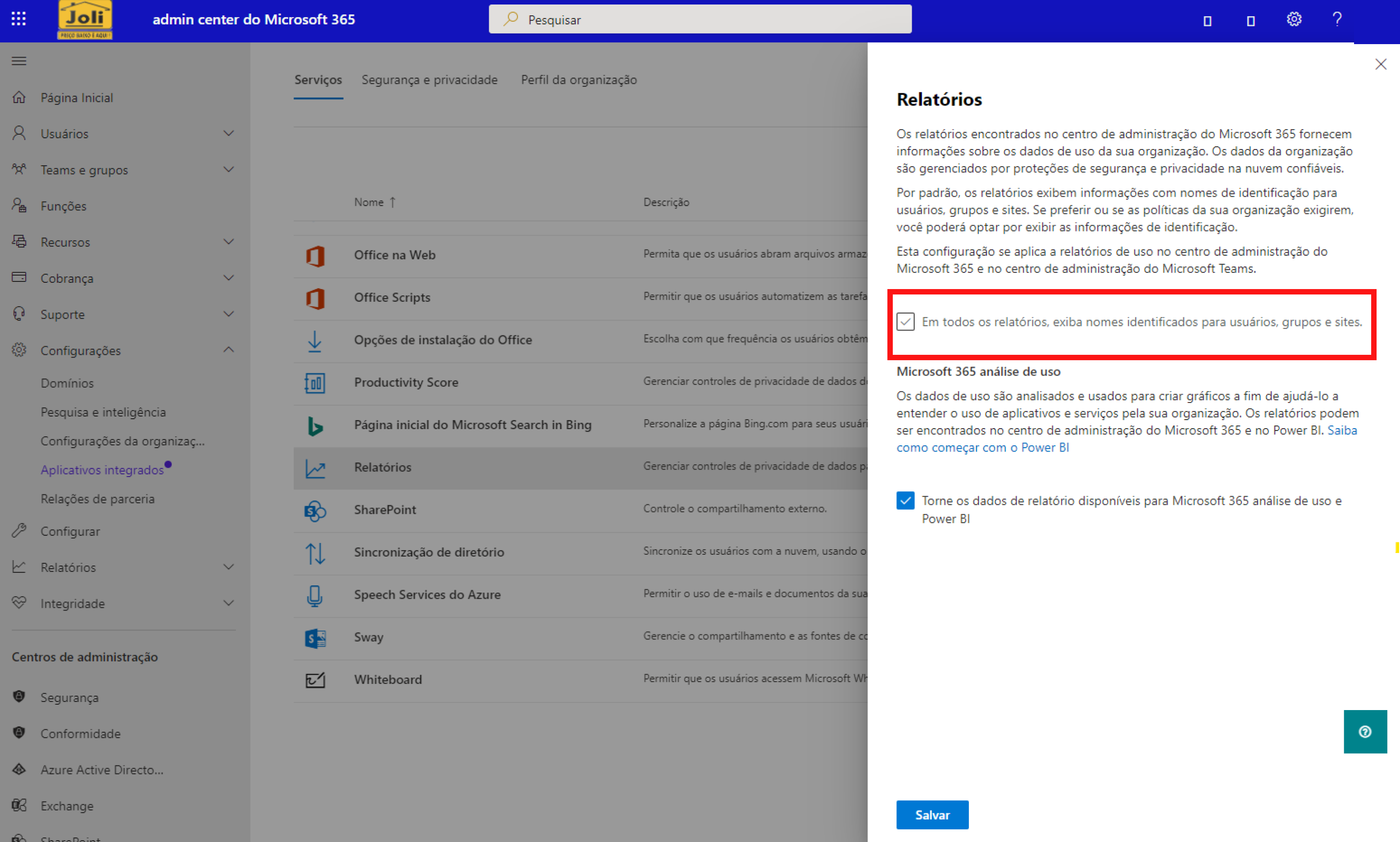 Nessa configuração, a configuração "Em todos os relatórios, exiba nomes identificados para usuários, grupos e sites." estará habilitada. ELA DEVE SER DESABILITADA e depois de desabilitar, deve apenas SALVAR.