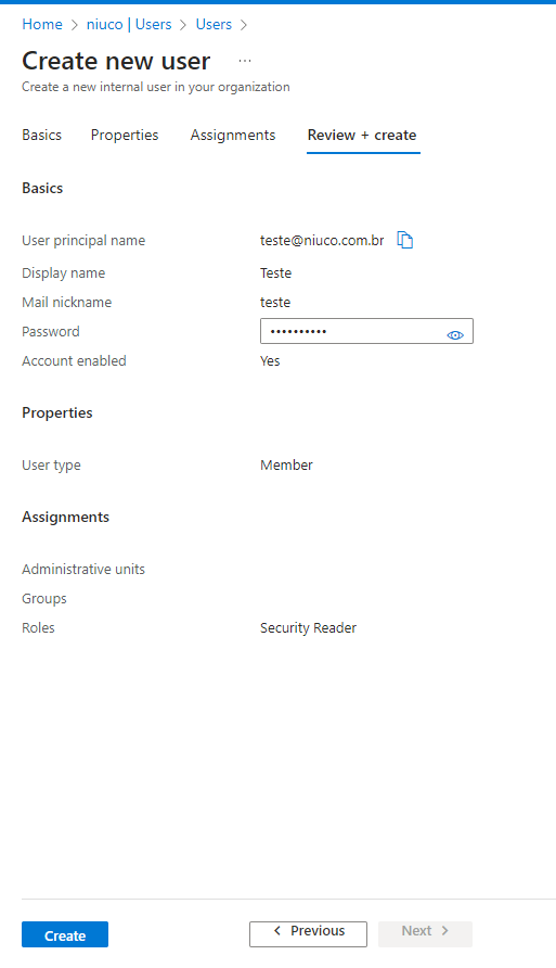 Na aba Review + create, revise as informações e por fim clique no botão Create