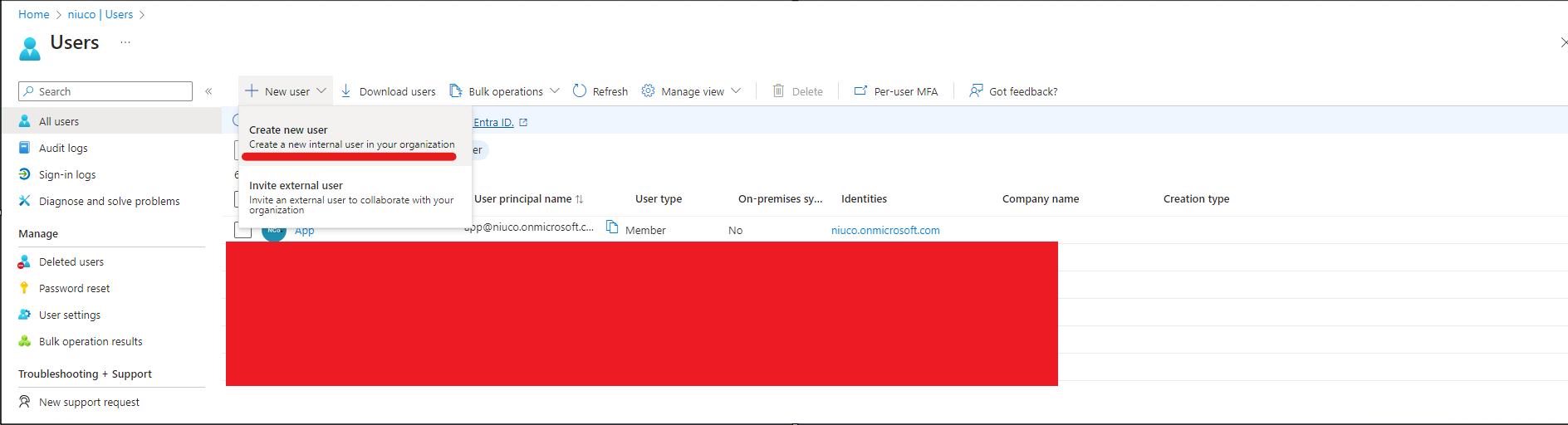 B1. Acesse a lista de usuários do Acesse o painel de controle do Microsoft Entra ID e selecione a opção New User > Create new user