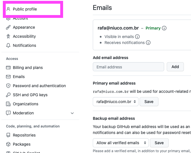 4.e. COM O EMAIL VERIFICADO, SELECIONE ELE COMO O EMAIL PÚBLICO, CONFORME PASSO 3