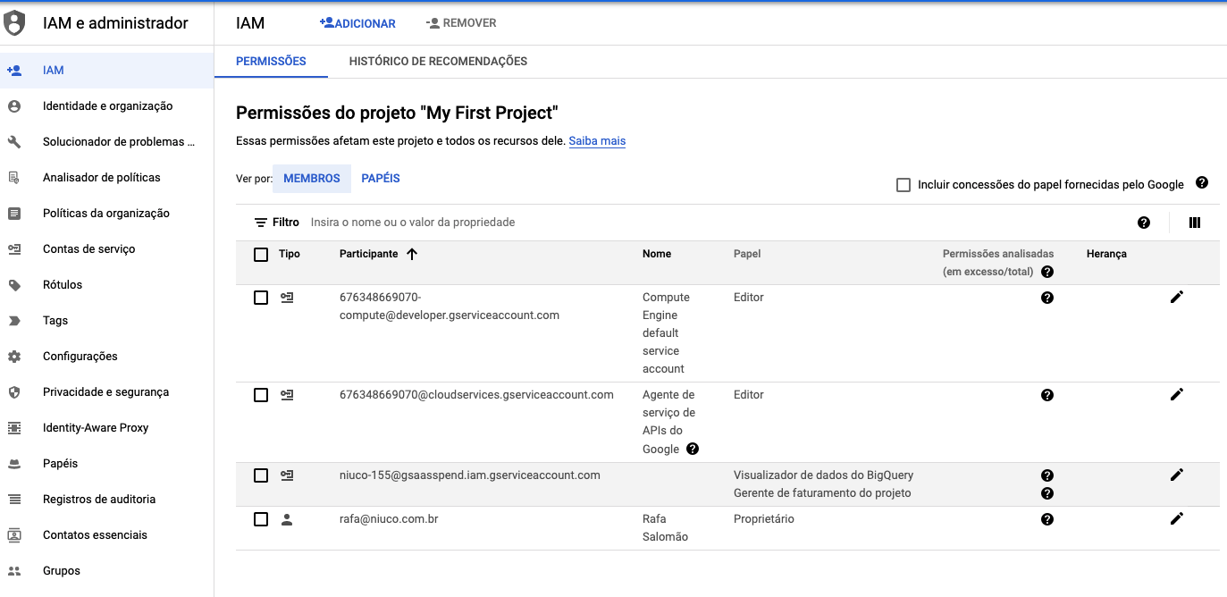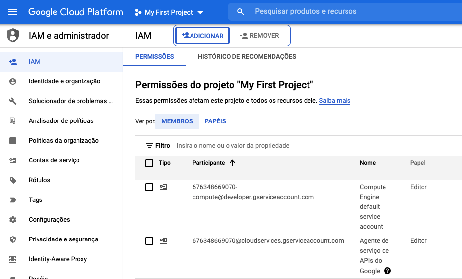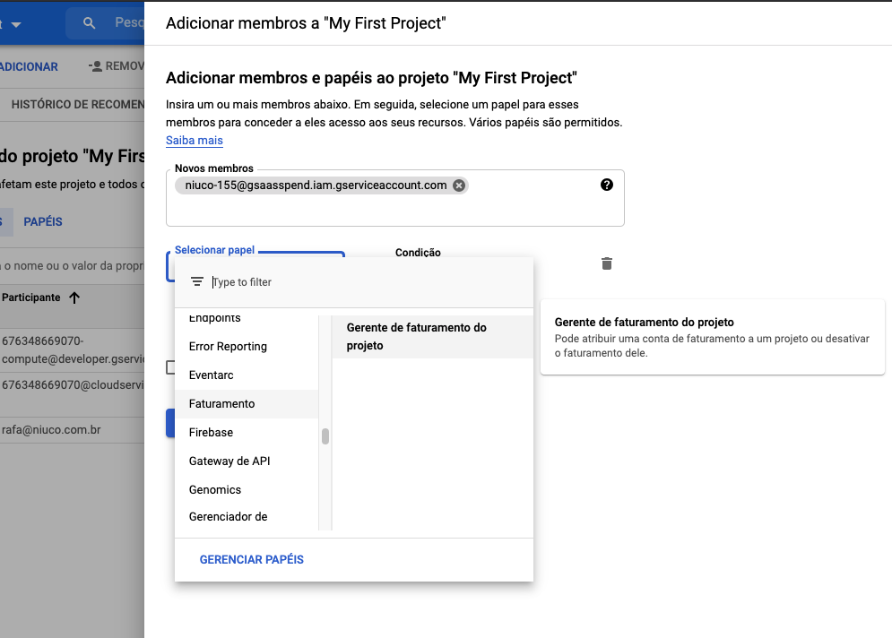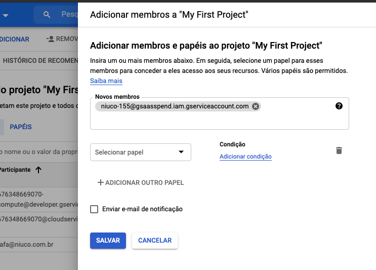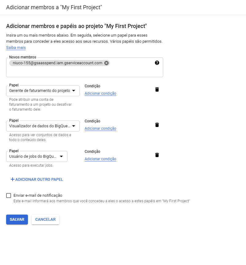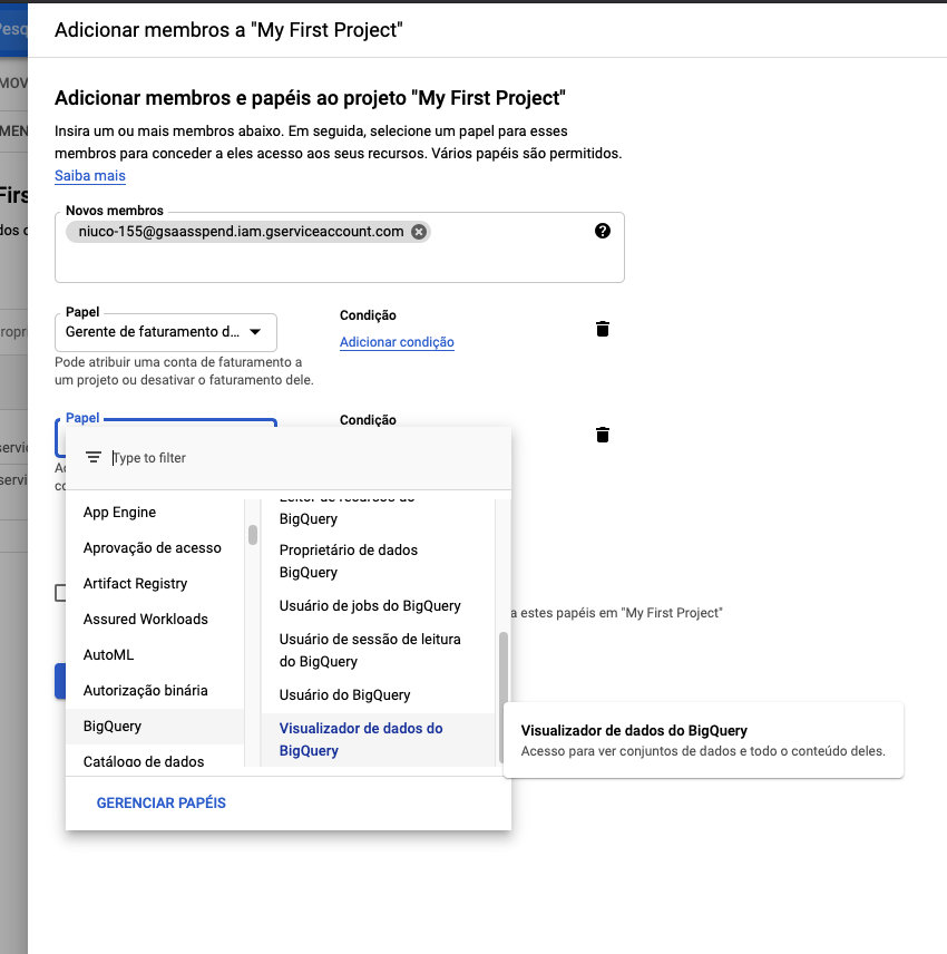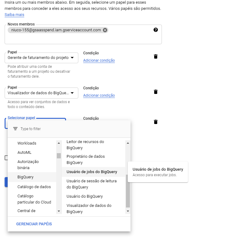 D. EM NOVOS MEMBROS, ADICIONE O EMAIL DO SERVICE ACCOUNT QUE PODE VER NA NOSSA INTERFACE.