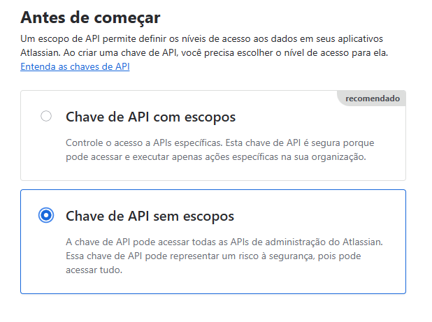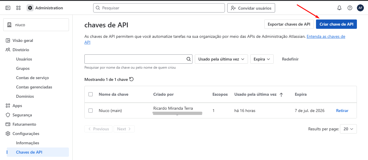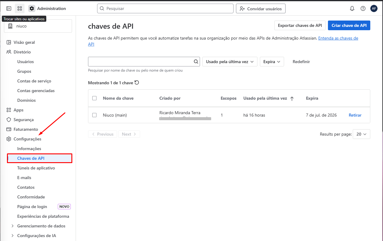 Faça o login no painel de administração da Atlassian, em CONFIGURAÇÕES selecione a opção CHAVES DE API.