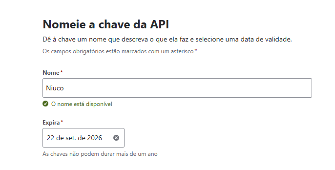 Nessa tela, adicione o nome de identificação de sua CHAVE DE API, e após isso, coloque DATA DE EXPIRAÇÃO para daqui 1 ano (esse é o valor máximo permitido e evite que haja desconexão).