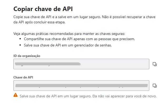 Nessa etapa, você verá o ID DA ORGANIZAÇÃO e a CHAVE DA API. Copie as informações para preencher no passo a seguir.