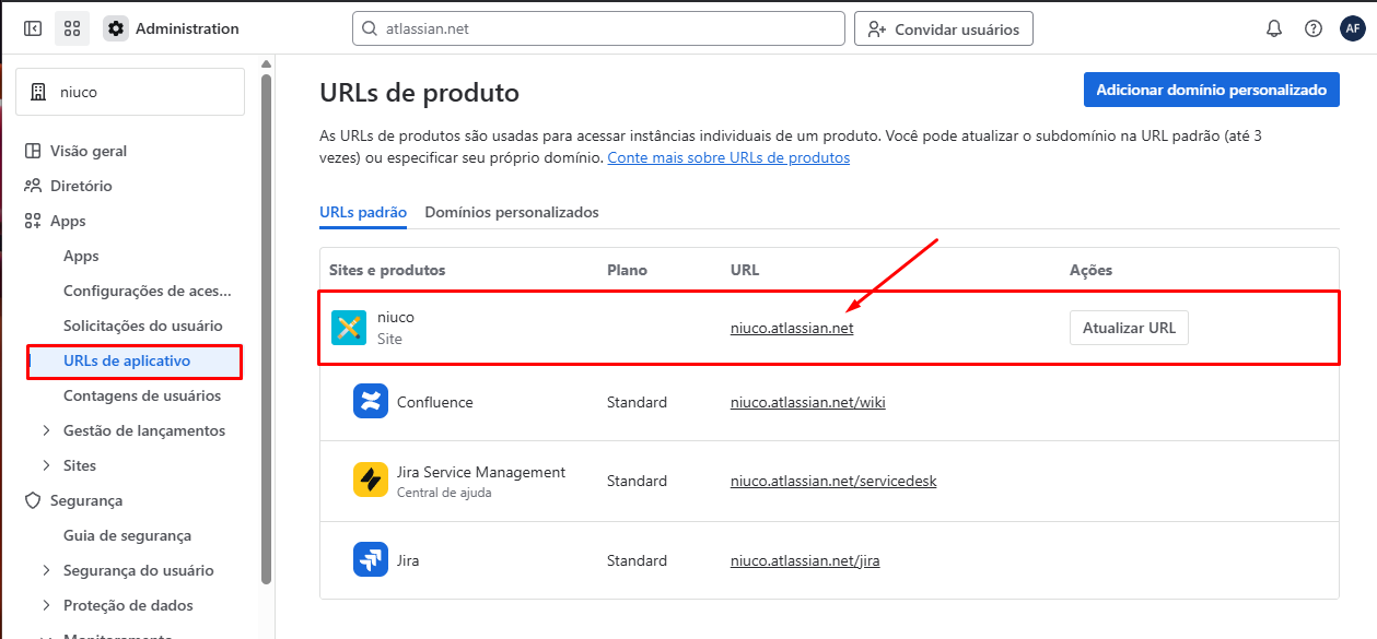 Além dos dados recuperados anteriormente, precisamos do endereço do site configurado na plataforma da Atlassian para recuperar os dados de utilização corretos, para isso, basta seguir os próximos passos: