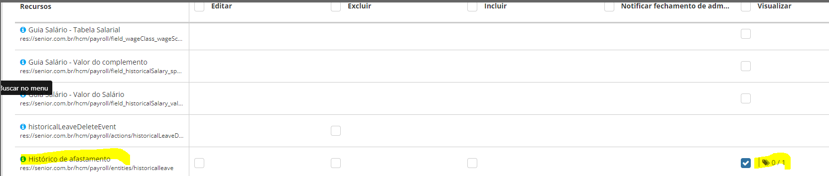 Selecione o item "historicalleave" na coluna VISUALIZAR.