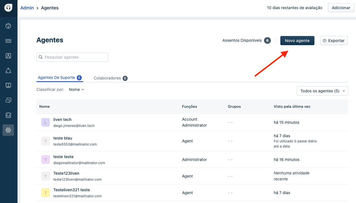 - Clique na guia Admin no painel esquerdo > Equipe > Agentes