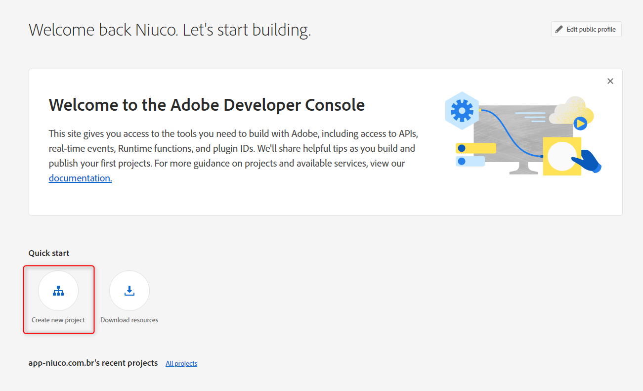 Para poder usar nossa integração com o Adobe, será necessário criar um novo projeto no Developer Console e recuperar alguns dados de conexão.