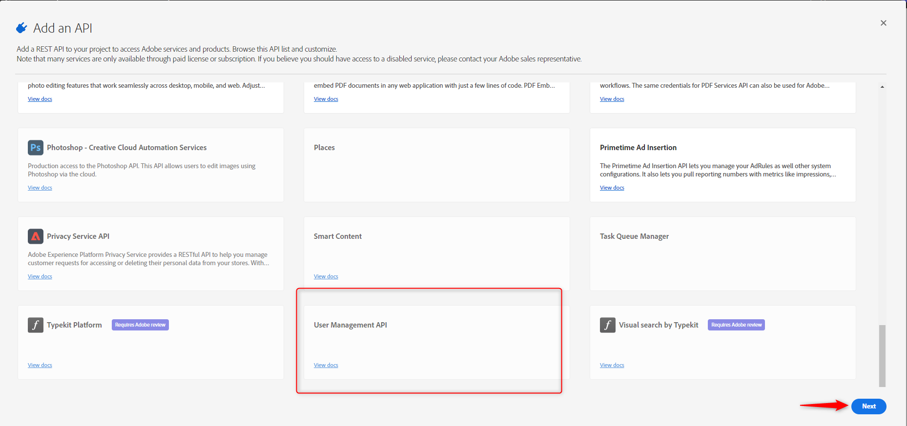 4. Neste momento uma modal contendo as opções de APIs será exibida, procure e selecione a User Management API e clique no botão Next.