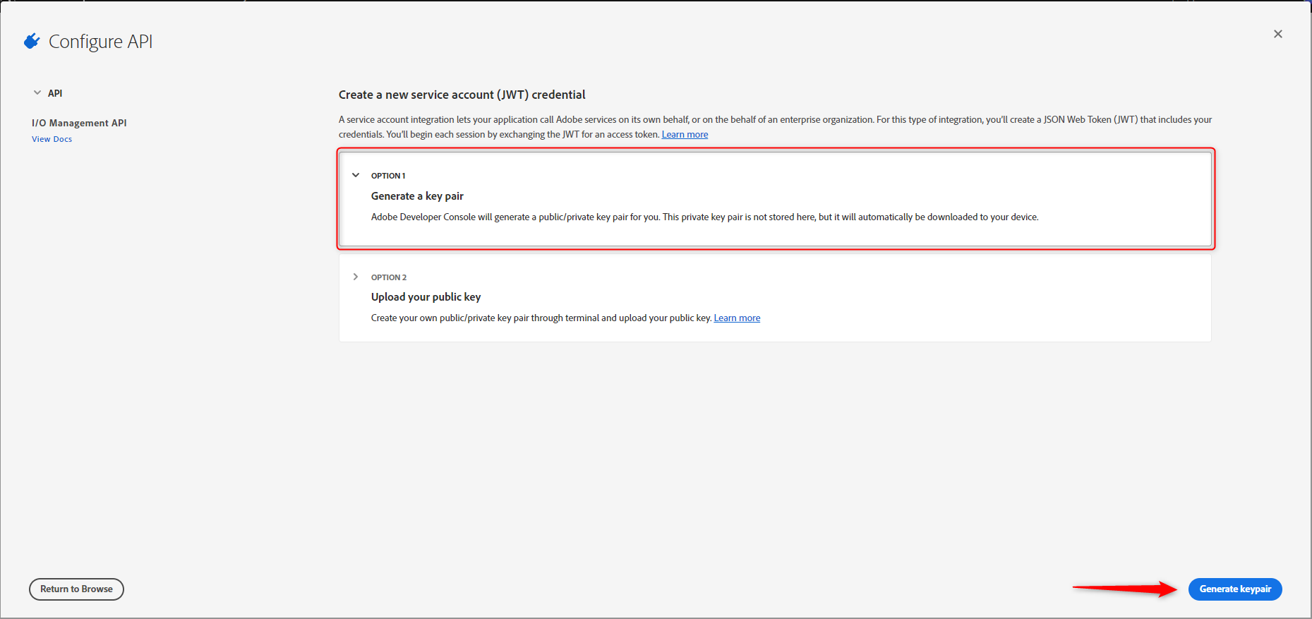 5. Ao avançar para o próximo passo, mantenha a opção 1 selecionada para que o próprio site gere uma nova chave privada para a conexão com a API e em seguida clique no botão Generate keypair.