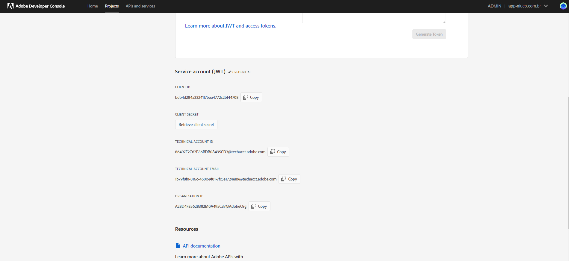 7. Role para baixo na página que será carregada, nela encontraremos os seguintes valores CLIENT ID, CLIENT SECRET (clique no botão Retrieve client secret para visualizar o valor do campo), TECHNICAL ACCOUNT ID e ORGANIZATION ID. Copie e guarde seus valores pois iremos utiliza-los durante a conexão na plataforma da Niuco.