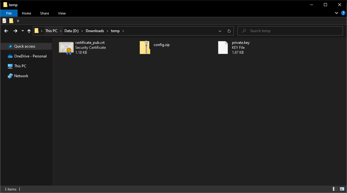 8. Para finalizar agora precisaremos copiar o conteúdo da chave privada que geramos anteriormente. Abra o local em que o arquivo config.zip foi armazenado na sua máquina durante o download no passo 6 e extraia seu conteúdo.