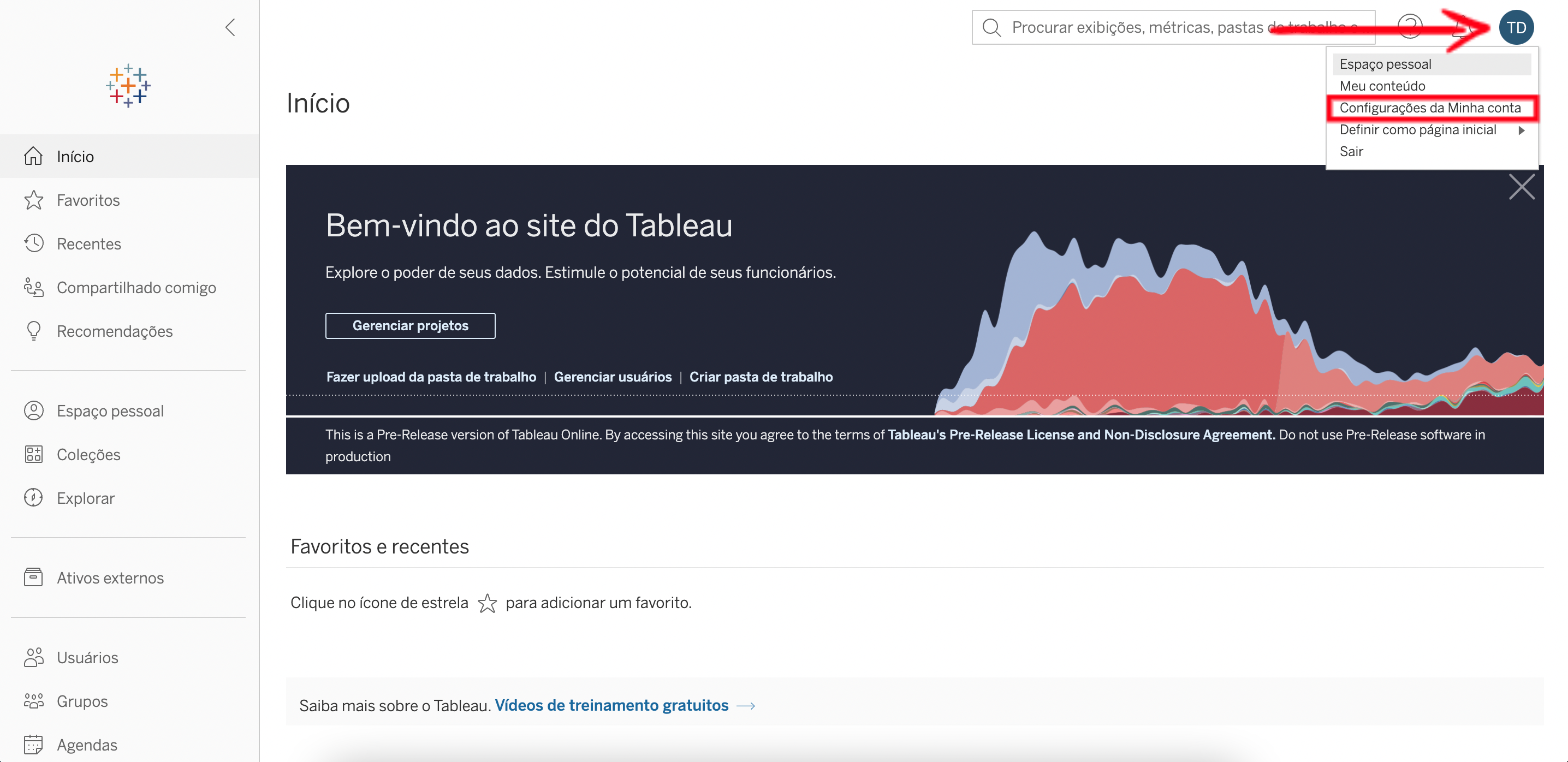 4. Clique nas iniciais do nome de usuário no canto superior direito e selecione a opção Configurações da Minha Conta no menu