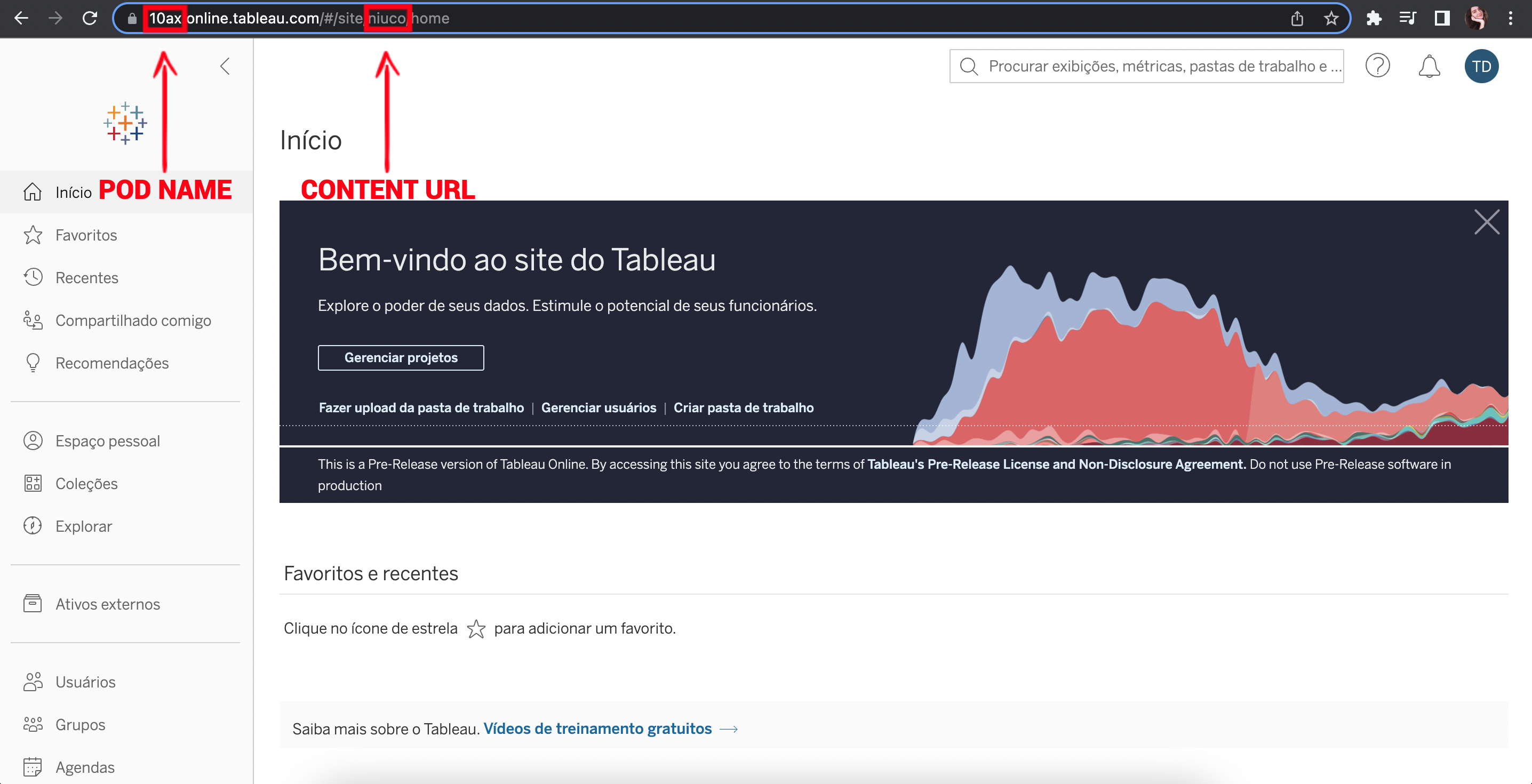 8. Por último, vamos precisar de mais duas informações, o Pod name e Content url, ambos são encontrados na url na página inicial do Tableau