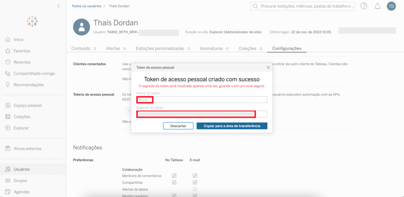 Pronto, agora basta você acessar nossa ferramenta e ao cadastrar o Tableau, compartilhar o Nome do token, Segredo do token, Pod name e Content url para nos dar autorização.