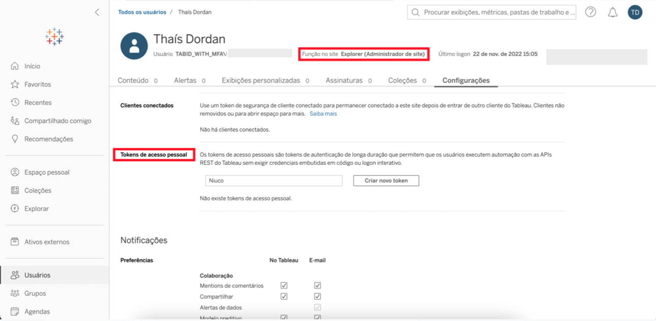 5. Na tela de configurações, é possível verificar a Função no site (precisa ser Administrador de site). Caso seu usuário tenha a função necessária, desça até encontrar a opção Tokens de acesso pessoal