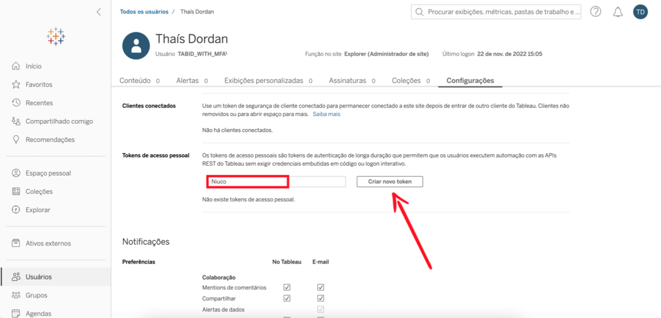2. Como um administrador de Site, é possível configurar quem pode configurar e criar Tokens de acesso pessoal. Em Sites ativados a partir de Junho de 2023, a opção de criá-los vem desativada por padrão, para ativá-la, acesse a aba de configurações.