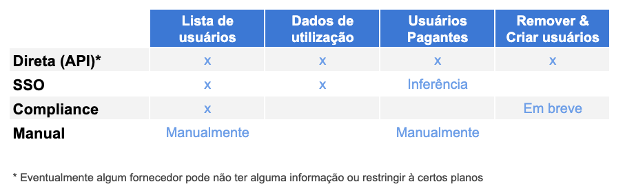 4) Conexão Manual. Para os casos que não existem APIs disponíveis e o software não está presente em nenhuma das 3 integrações acima, temos uma forma de você adicionar manualmente um fornecedor. Com isso, consegue listar os usuários e controlar os gastos dele.