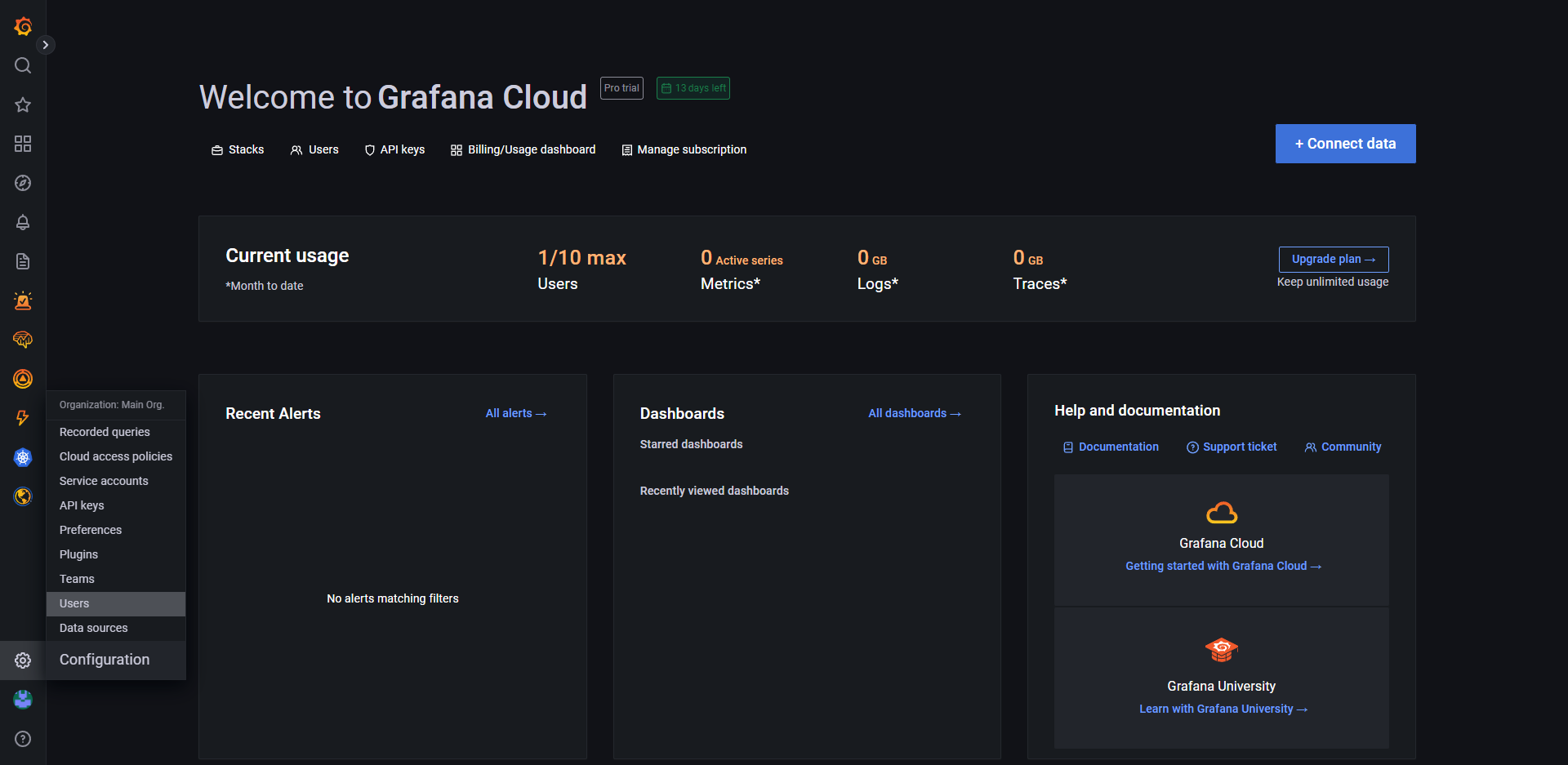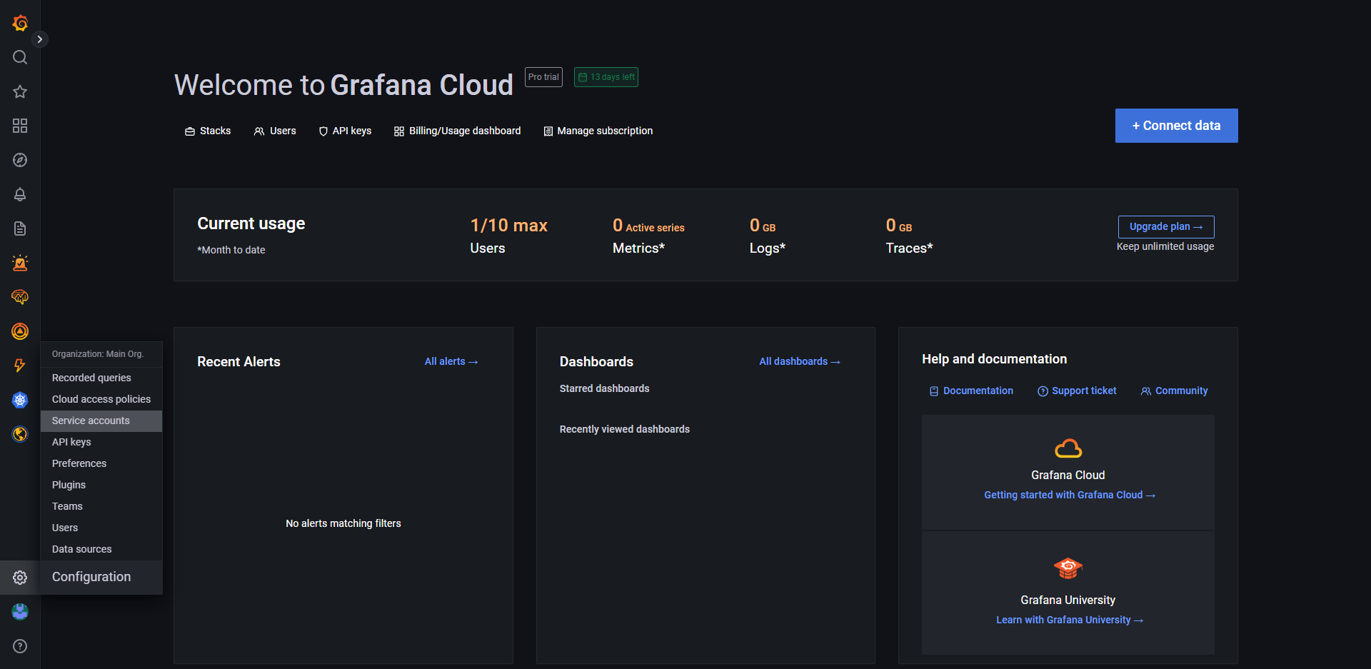 3. Visualize a URL atual no seu browser, deve estar no formato: https://<organization_id>.grafana.net. No lugar do que colocamos como <organization_id> sua URL terá o nome, este é o Organization ID da sua organização principal.