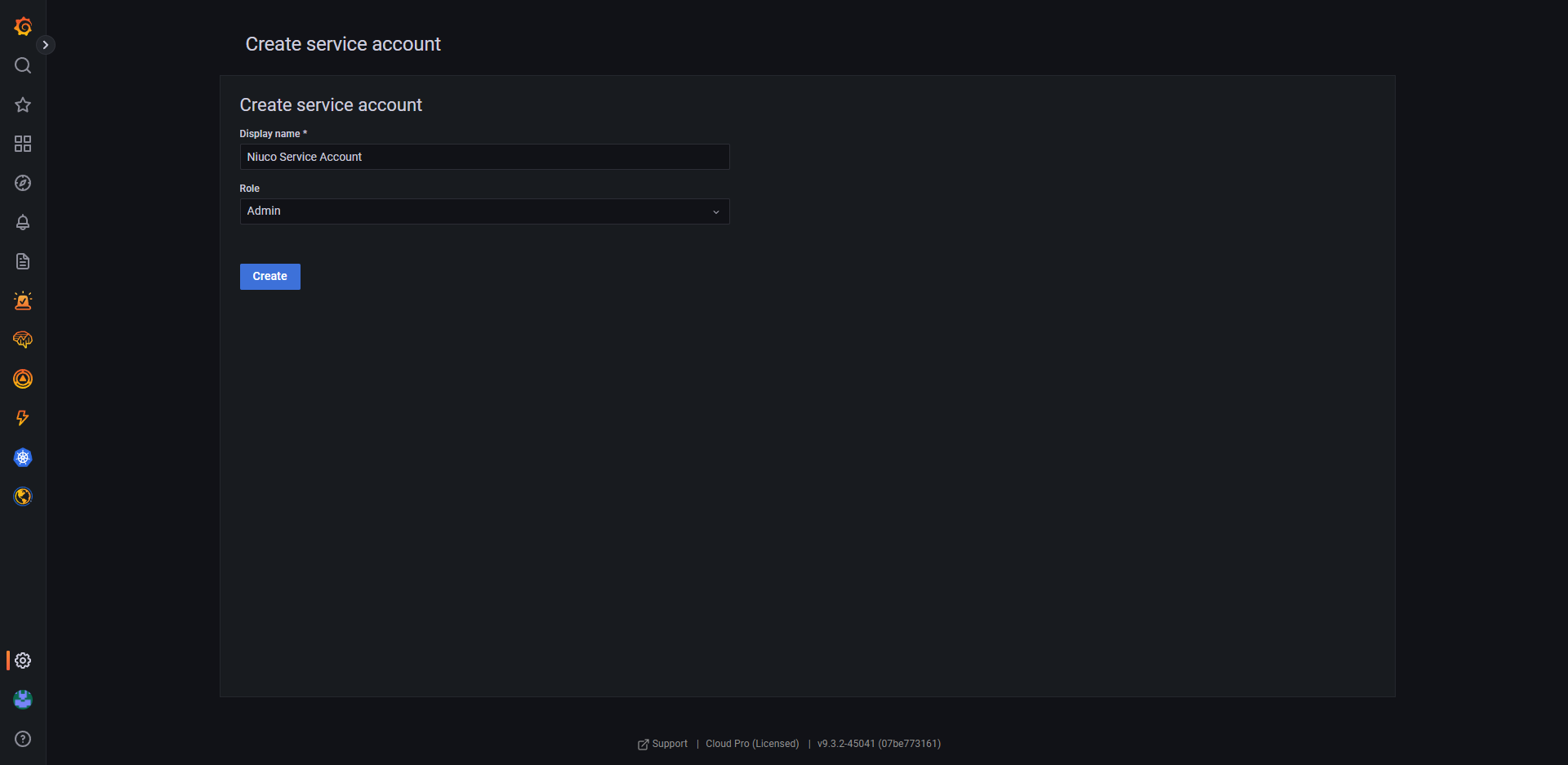 3. No campo Display name coloque o nome "Niuco Service Account", no campo Role selecione "Admin" e clique em Create