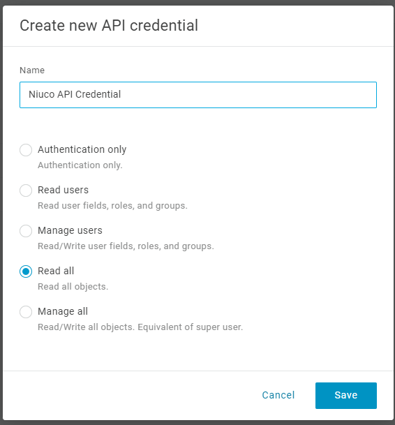 4. Coloque o nome Niuco API Credential, selecione Read all para somente listar os usuários e clique em Save