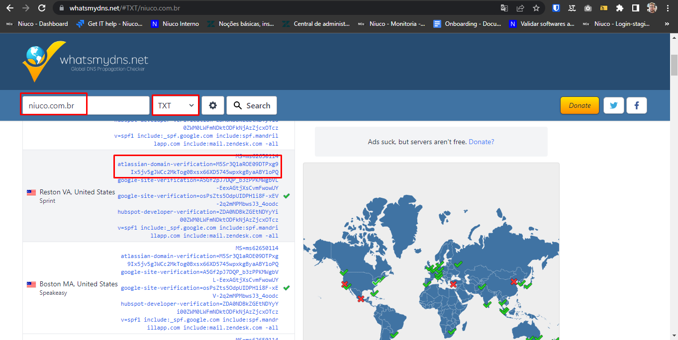 Você pode verificar se o seu domínio foi propagado corretamente no Atlassian através do registro TXT em sites como este: https://www.whatsmydns.net/#TXT/ ou https://dnschecker.org/#TXT/