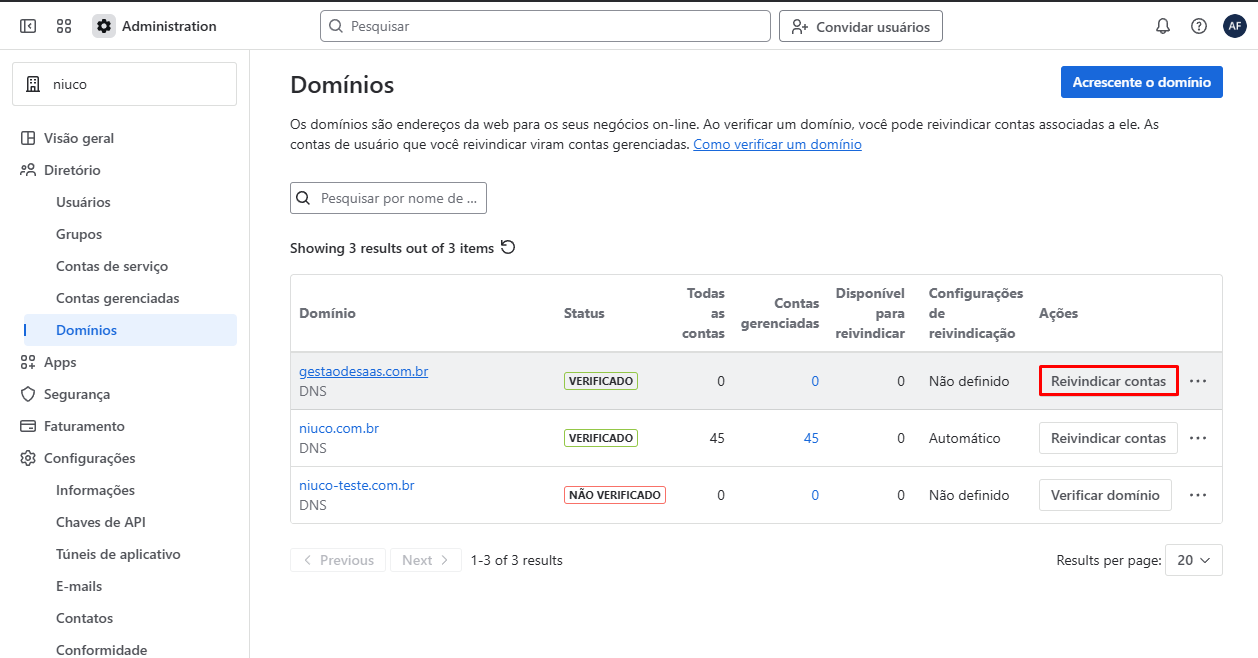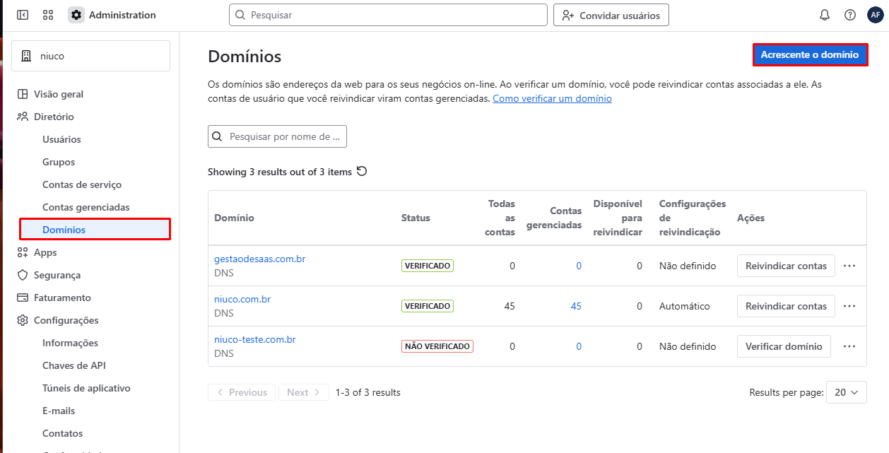 Você pode acrescentar mais de um domínio, sendo necessário inseri-los individualmente, e o domínio precisa ser o mesmo que consta no e-mail do usuário, por exemplo: alexander@niuco-teste.com.br.