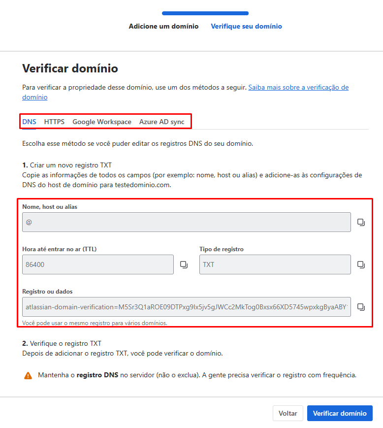 Após adicionar o registro TXT, e checar se o registro foi publicado no DNS no site whatsmydns, clique em “Verificar Domínio” no Atlassian. A plataforma irá verificar o DNS para garantir que as informações estejam corretas.