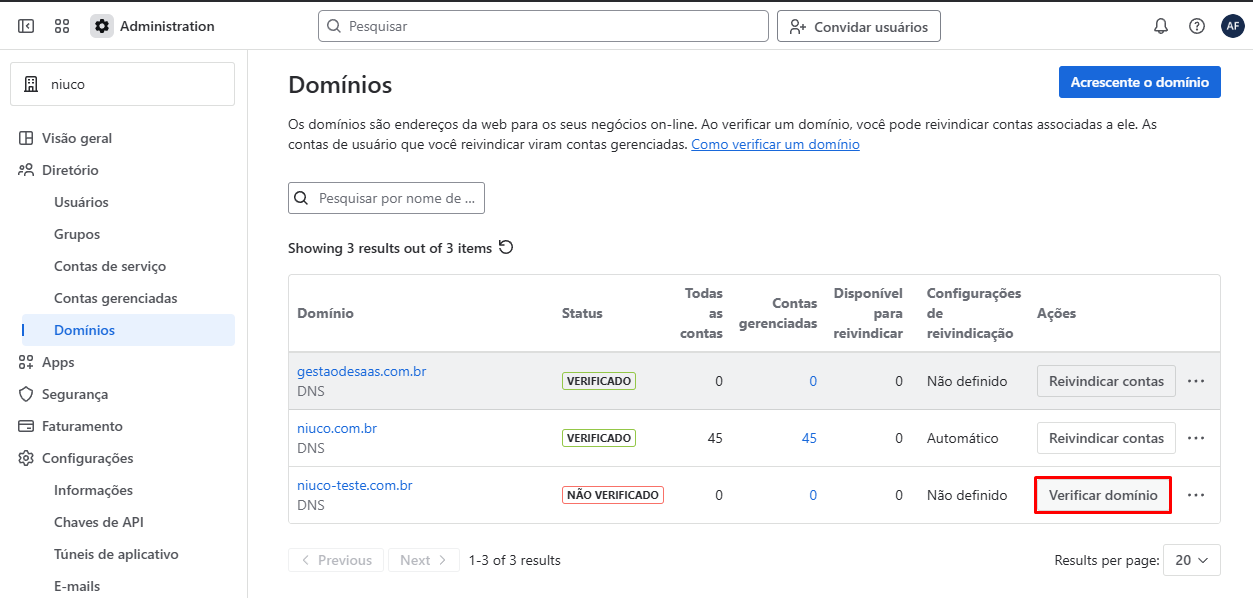A verificação do domínio pode levar até 72 horas para ser propagada em todos os servidores DNS, após esse período, todos os usuários do domínio @empresa.com.br serão adicionados à sua área de diretórios.