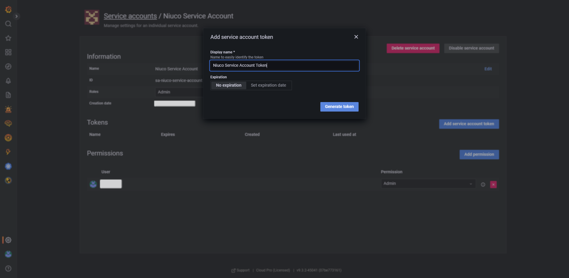 5. No campo Display name coloque o nome "Niuco Service Account Token", no campo Expiration selecione "No expiration" e clique em Generate token