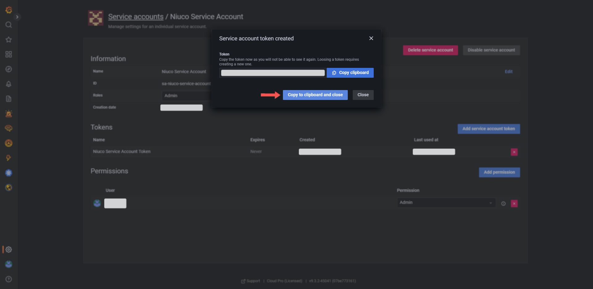 6. Pronto, um Service Account Token foi gerado! Agora clique em Copy to clipboard and close e envie o token para o nosso sistema.