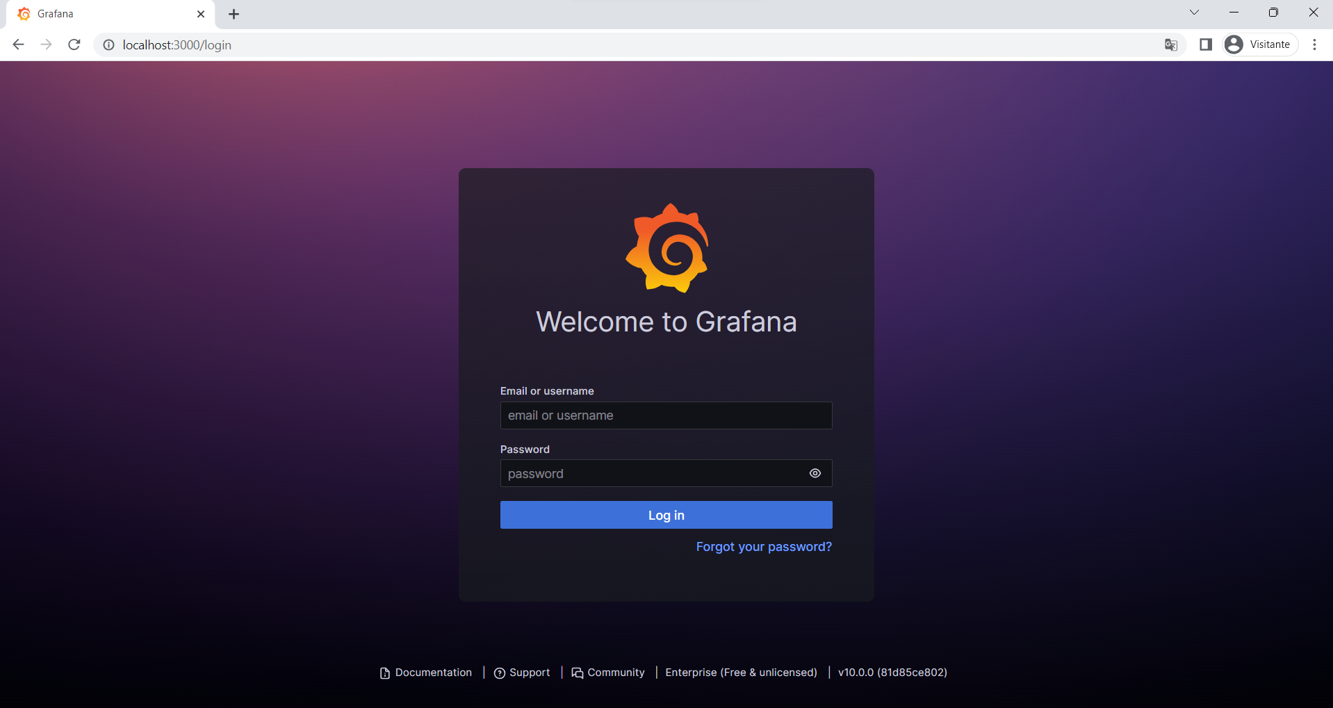 1. Acesse a área de login no seu endereço onde está hospedado o Grafana (no exemplo é localhost:3000, pois estamos rodando localmente), entre na sua conta;