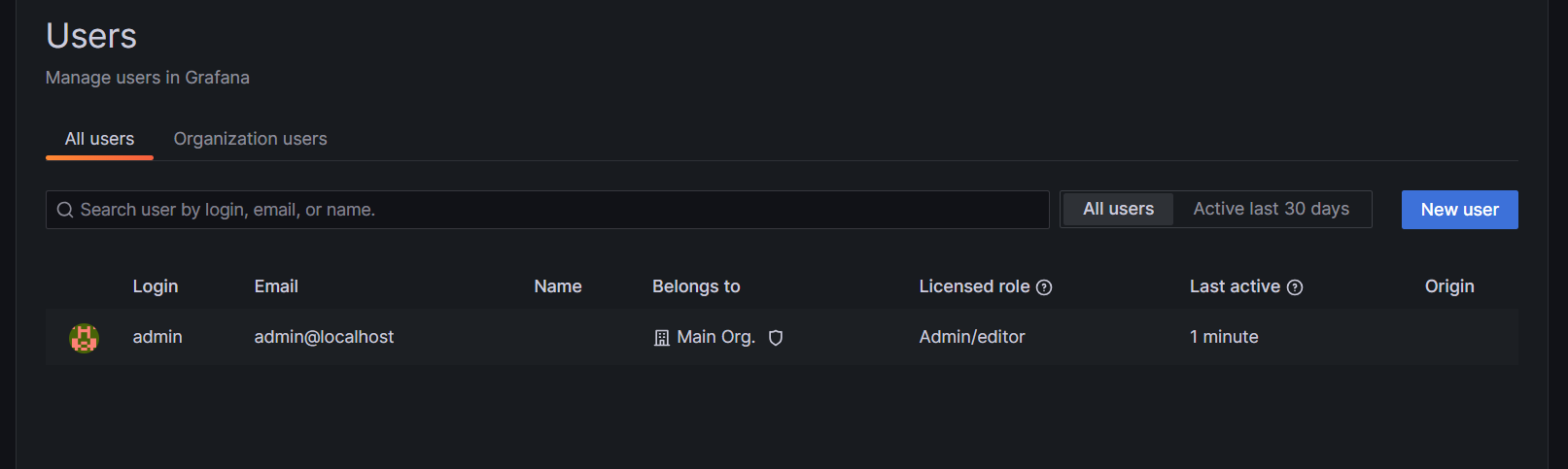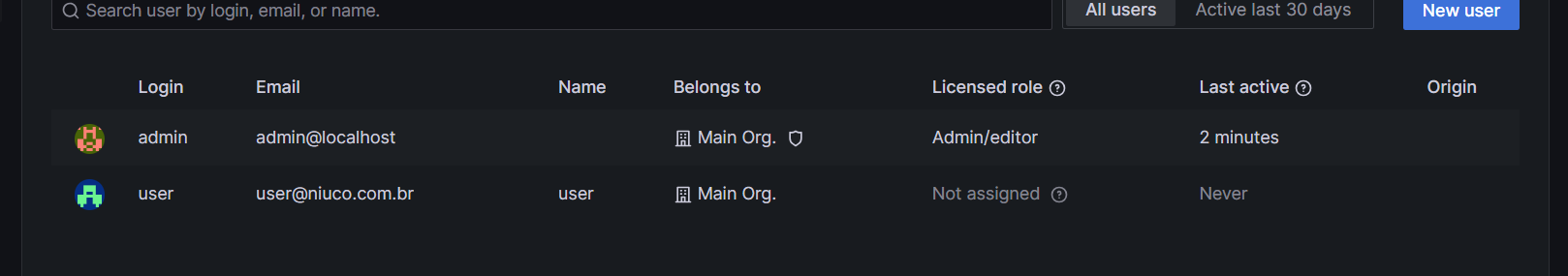 OBS.: Caso esteja utilizando uma versão do Grafana menor que a 9, para chegar nessa tela de usuários o caminho é um pouco diferente: no menu principal, vá em Server Admin > Users.