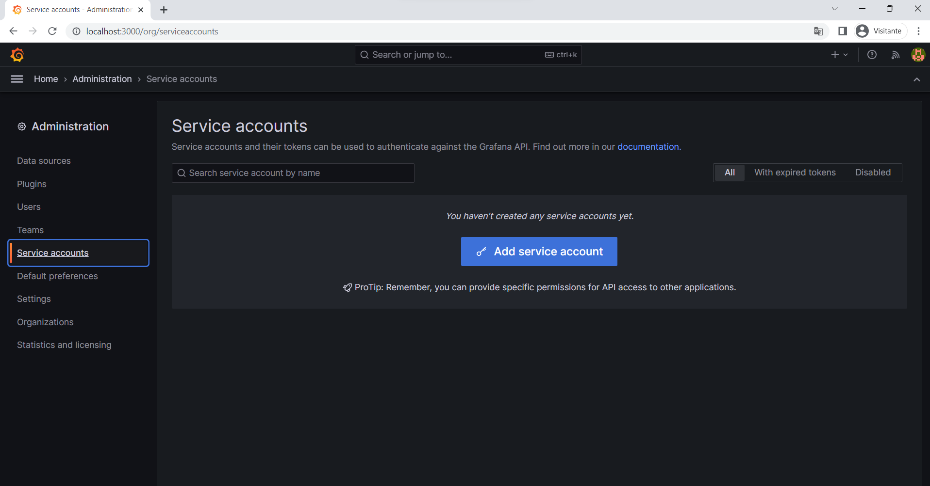 Tendo acesso a uma conta com um usuário do tipo Administrador, agora podemos criar um Service Account Token que será utilizado pelo nosso sistema para realizar a integração.