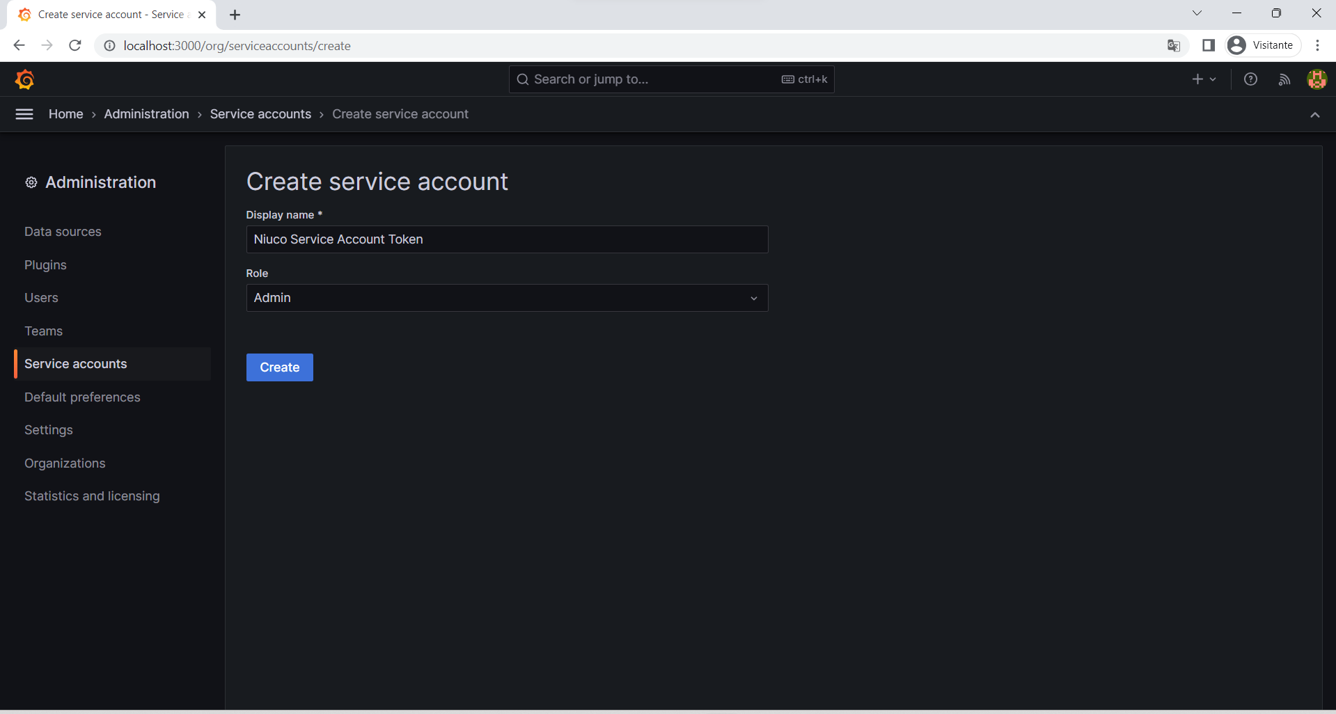 3. No campo Display name coloque o nome "Niuco Service Account", no campo Role selecione "Admin" e clique em Create