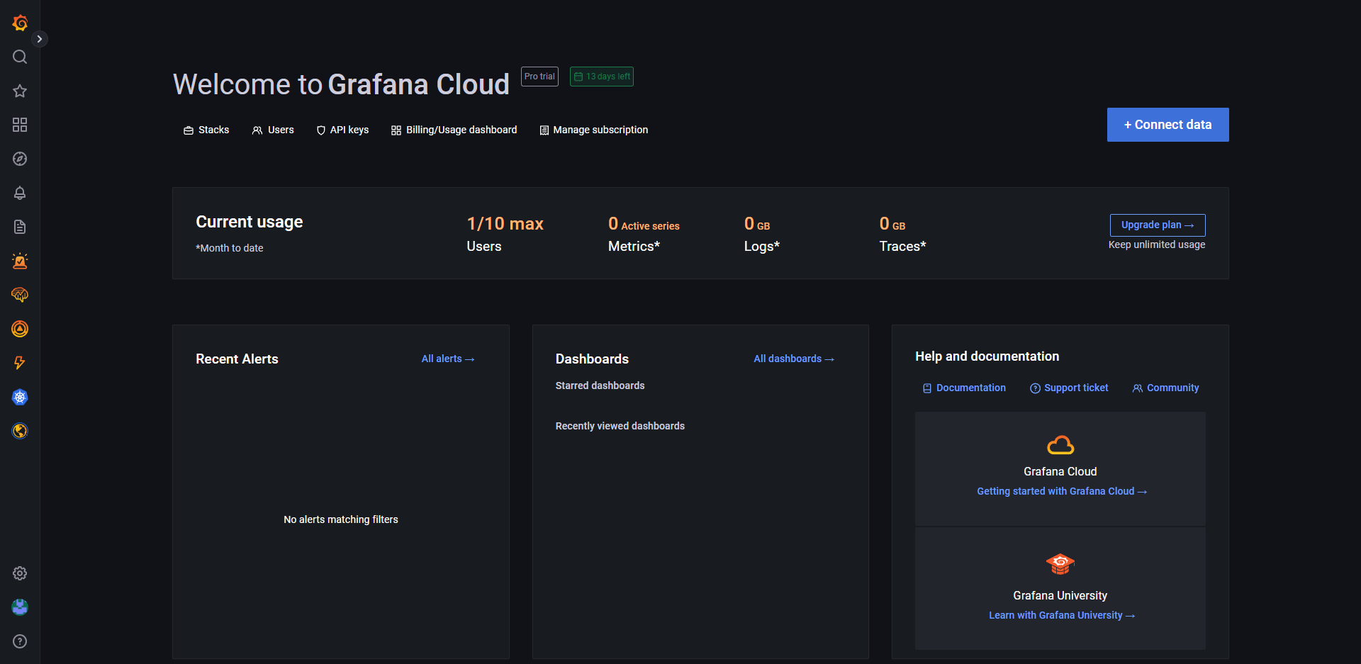 3. Visualize a URL atual no seu browser, deve estar no formato: https://<subdomínio>.grafana.net. No lugar do que colocamos como <subdomínio> sua URL terá o nome, este é o Subdomínio da sua organização principal.
