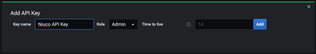 Precisamos que preencha os campos Key Name com o nome da chave (no exemplo, está como Niuco API Key), e com a Role Admin.