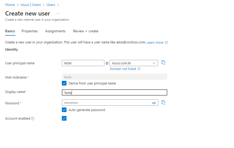 Na aba Basics , preencha as informações de Nome principal do usuário (este será o e-mail de acesso do novo usuário), DisplayName e Senha (caso necessário).
