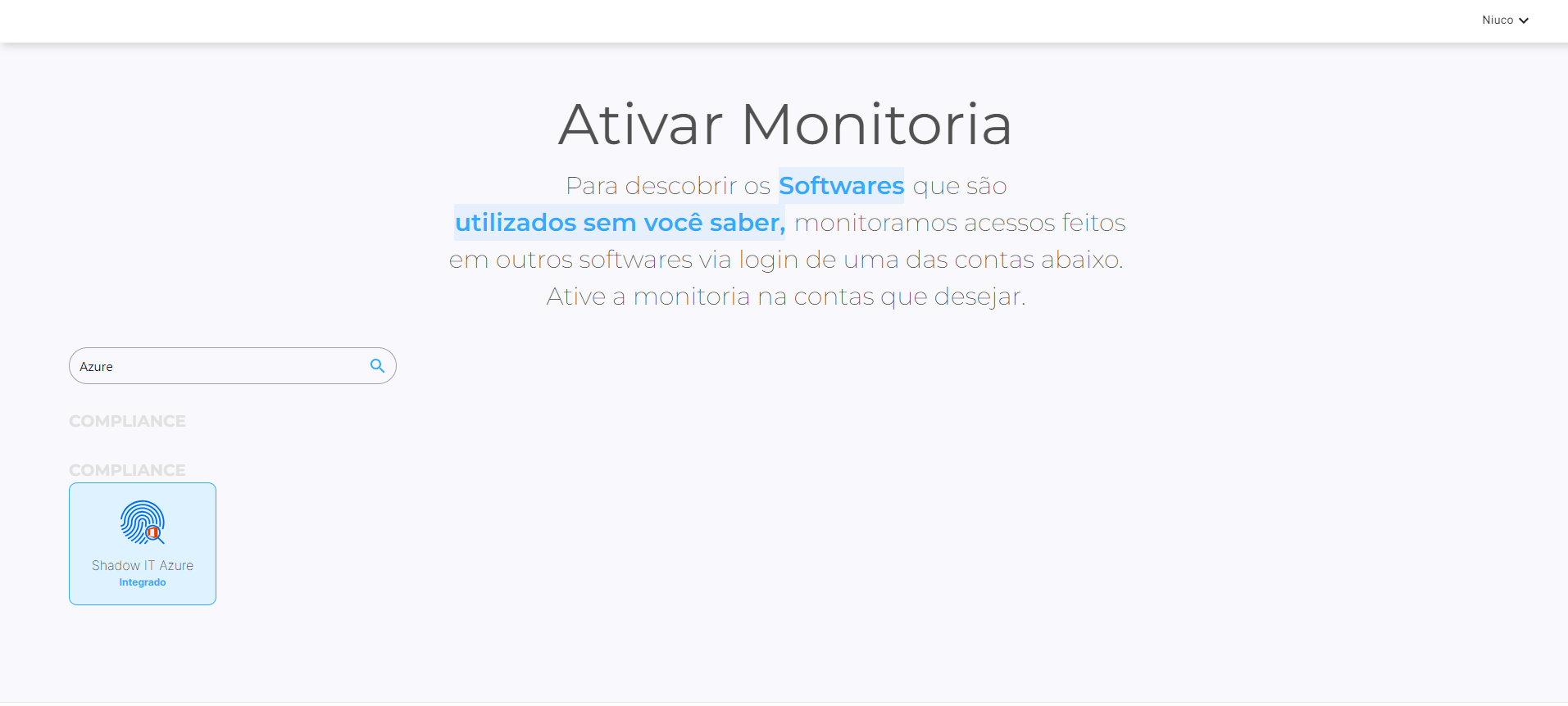 E1. Acesse sua conta no Niuco, navegue até a tela de conexão com Shadow IT e procure pelo Shadow IT Azure.